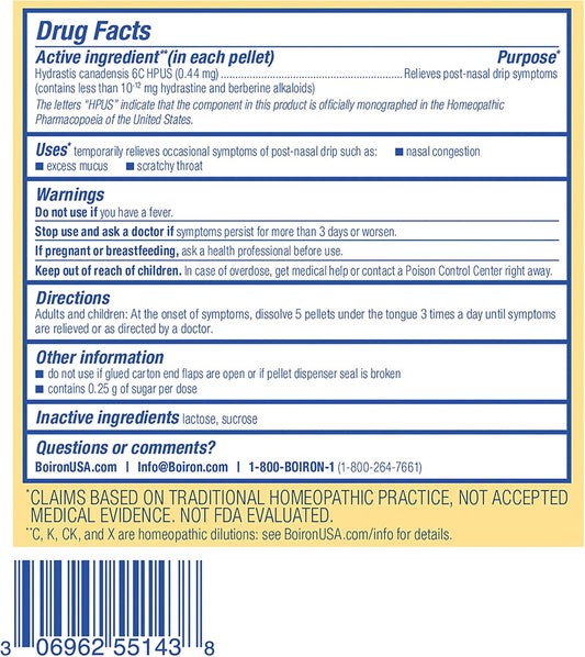 Boiron Hydrastis Canadensis 6C Homeopathic Medicine for Post-Nasal Drip Relief, Excess Mucus, Scratchy Throat - 3 Count (240 Pellets)