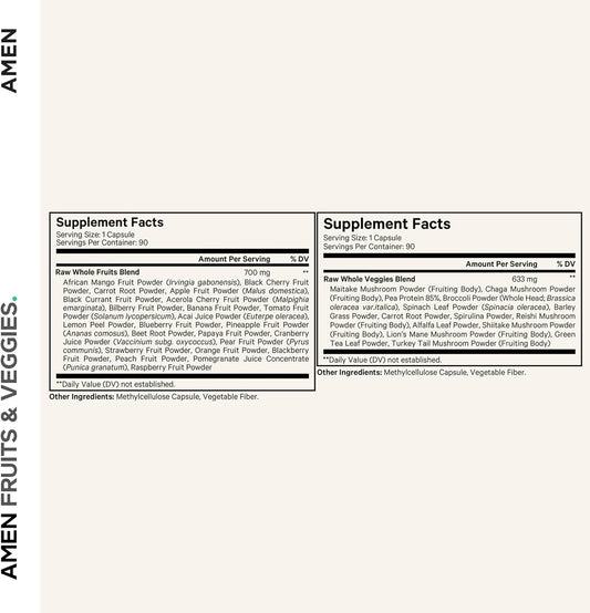 Amen Fruits + Veggies Vitamins Bundle, Raw Whole Food Multivitamin Capsules, Greens Vegetables, Red Fruits & Berries Vegan Blend, Fibers + Phytonutrients Superfood Minerals Supplement, Non-GMO, 180 ct