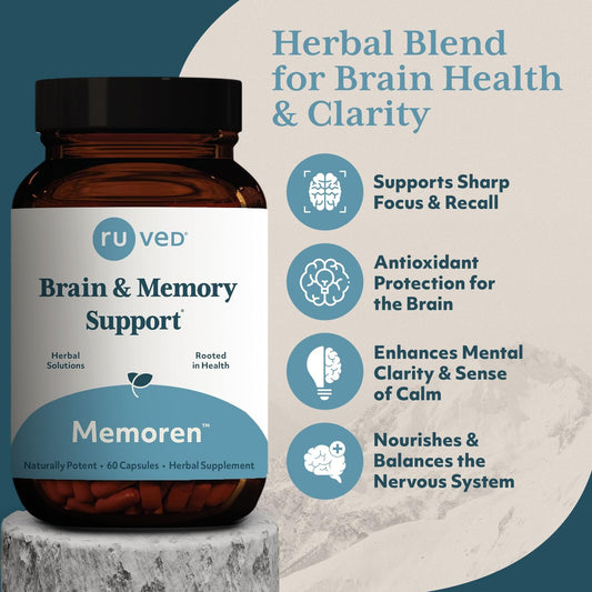 ruved Memoren, All-Natural Ayurvedic Focus and Memory Support with Ginkgo Biloba, Gotu Kola and Bacopa, Brain Health and Stress Care Supplement for Adults, 60 Vegetarian Capsules