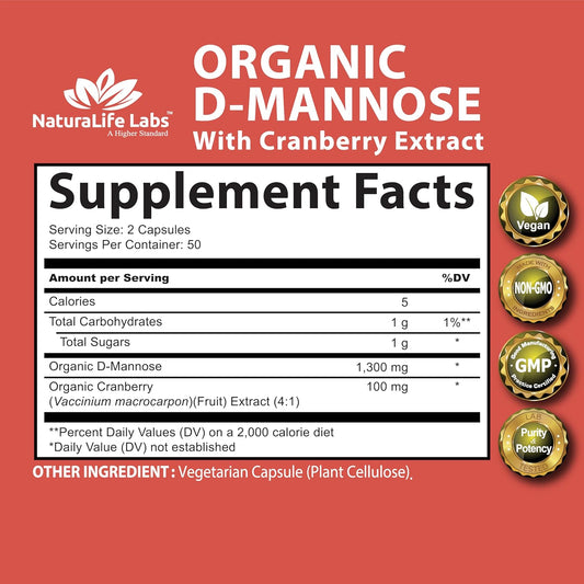 NaturaLife Labs A Higher Standard Organic D-Mannose 1,300 mg with Cranberry Extract Fast-Acting, Flush Impurities, Urinary Tract Health- 100 Veggie Capsules