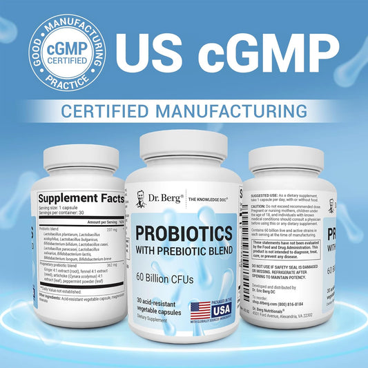Dr. Berg Probiotic Supplement (60 Billion CFUs) - Helps Ease Occasional Constipation, Diarrhea, Gas & Bloating* - Pre and Probiotics for Digestive Health - 30 Probiotic Capsules