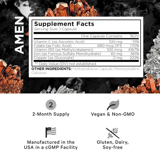 Amen Iron Ultra Supplement + Copper, Folate, Vitamin C and B12-2-Month Supply - Ferrous Sulfate Iron Vitamin - 65mg Per Serving - Folic Acid - Non-GMO Pills - 60 Capsules
