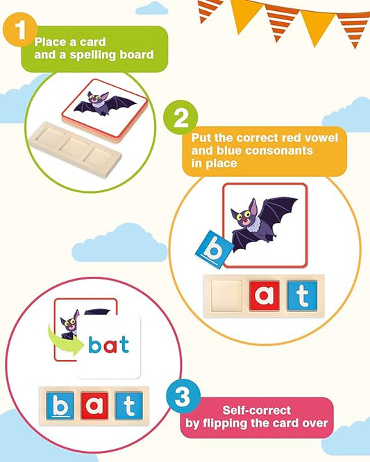 Gojmzo Wooden CVC Word Spelling Games, Preschool Kindergarten Learning Activities, Montessori Educational Toys Gifts for 3 4 5 6 Year Old Kids, Sight Words Flash Cards Reading Letters for Toddlers