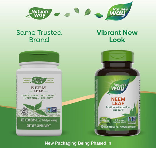 Nature's Way Herbal Neem Leaf, Traditional Intestinal Support*, Used in Ayurveda, 950 mg per 2-Capsule Serving, Non-GMO Project Verified, Vegan, 100 Capsules (Packaging May Vary)