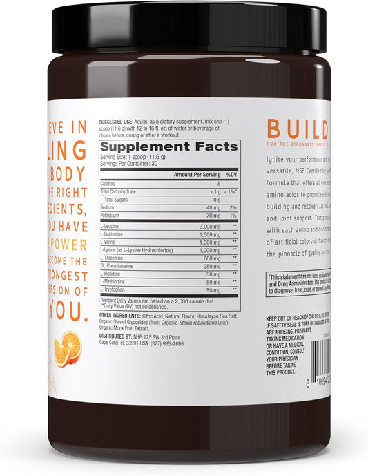 Dr. Mercola Pure Power Essential Amino Acids with BCAA, Orange Flavor, 12.3 oz (350 g), 30 Servings, 8 g of EAA, 6 g of BCAA, 0 g of Sugar, Non-GMO, NSF Certified for Sport
