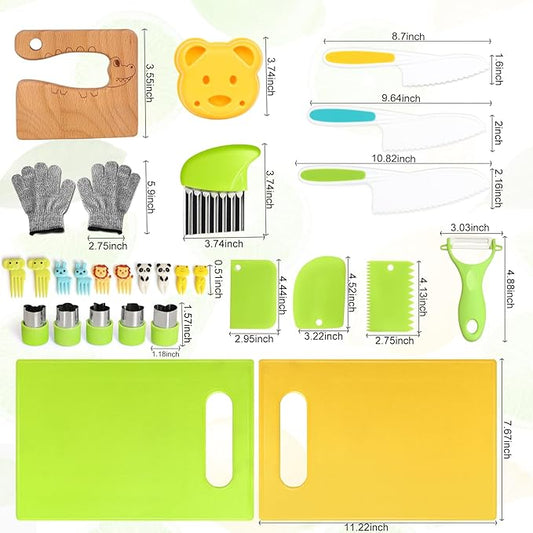 28PCS Toddler Knife Set - Kids Knifes for Real Cooking, Montessori Kids Kitchen Knife Set with Cutting Board Crinkle Cutters Kid Safe Knives, Toddlers Kitchen Tools for Age 2-10 Year Old Girl Boy