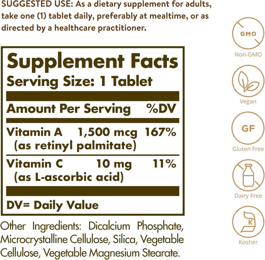 Solgar Dry Vitamin A 1500 mcg (5000 IU), 100 Tablets - Supports Healthy Eyes, Skin & Immune System - Non-GMO, Vegan, Gluten Free, Dairy Free, Kosher - 100 Servings