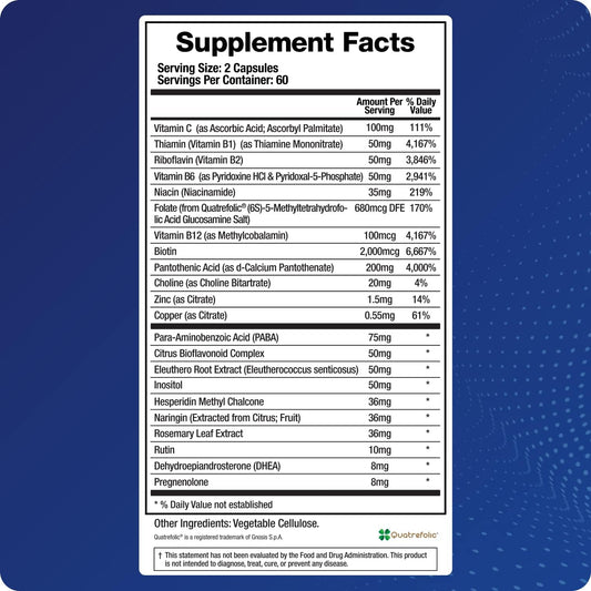 Adrenal Fatigue Supplement, Cortisol Manager, 5-MTHF, B Vitamins, Vitamin C, Adaptogens, Bioflavonoids, DHEA, Inositol, 30-60 Day Supply | 120 Veggie Caps