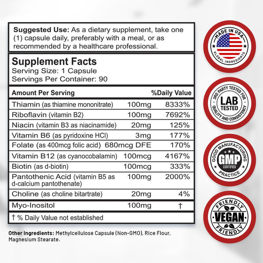 Vitamin B Complex for Men & Women - Made in USA - B-Complex: B1, B2, B3, B5, B6, B7, B8, B9, B12 with Vitamin C, Choline, Inositol - Energy, Brain & Heart Support Supplement, 60 Vegan Capsules