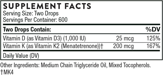 THORNE Vitamin D + K2 Liquid with a metered Dispenser - Vitamins D3 and K2 to Support Healthy Bones and Muscles* - 1 Fl Oz (30 ml) - 600 Servings