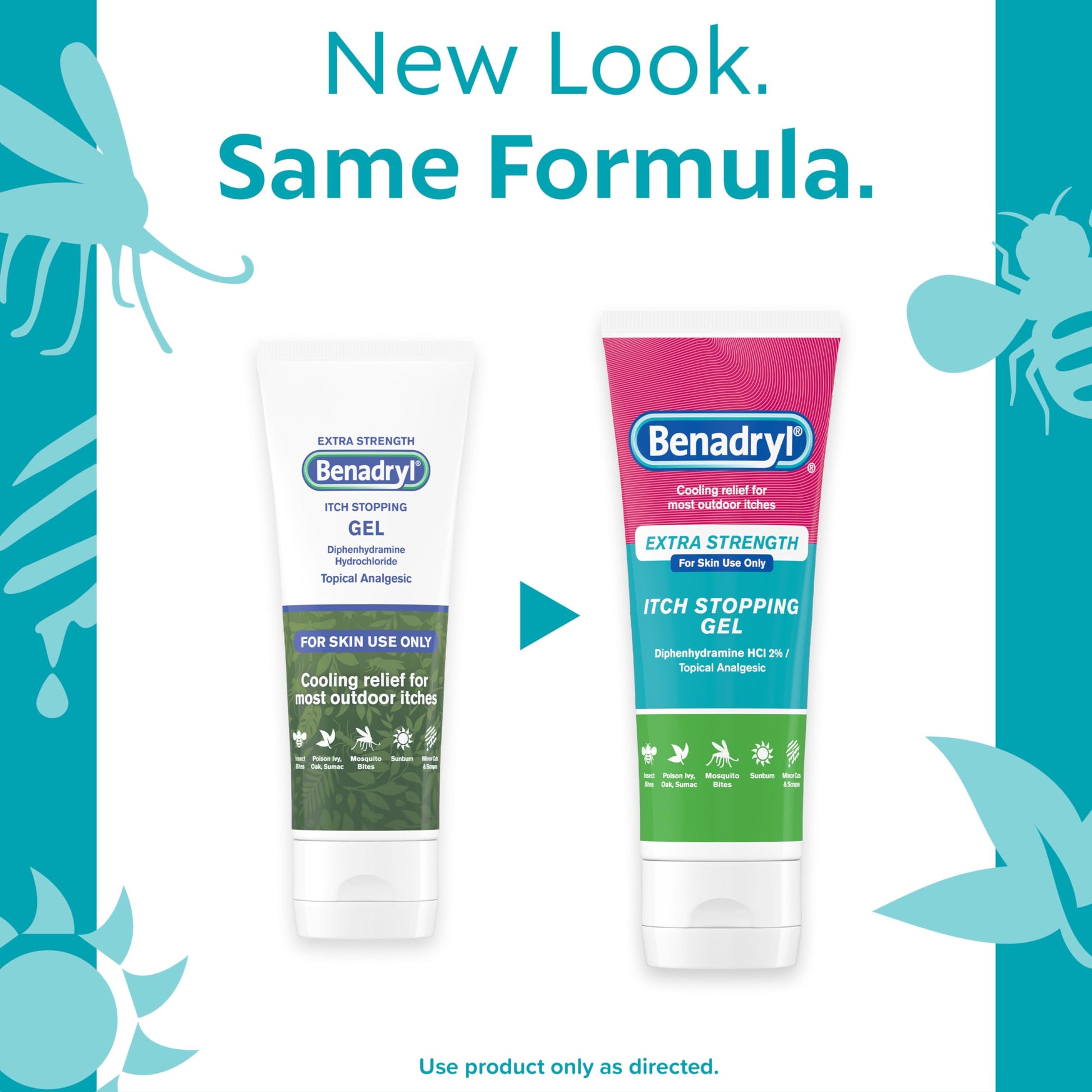 Benadryl Extra-Strength Itch Stopping Gel works when you need it most and provides fast and cooling relief from pain and itching. Made with 2% diphenhydramine HCI topical analgesic, this cooling anti-itch and pain relief gel blocks the histamine that causes minor pain and itching associated with insect bites, scrapes, minor skin irritations, burns, and cuts as well as relief of pain and itching associated with sunburns. It also dries the oozing and weeping of poison ivy, poison oak and poison sumac. This soothing topical gel is intended for ages two and up and is great to keep on hand for Extra Strength Itch Relief during outdoor activities such as camping, hiking or taking a walk with the family.