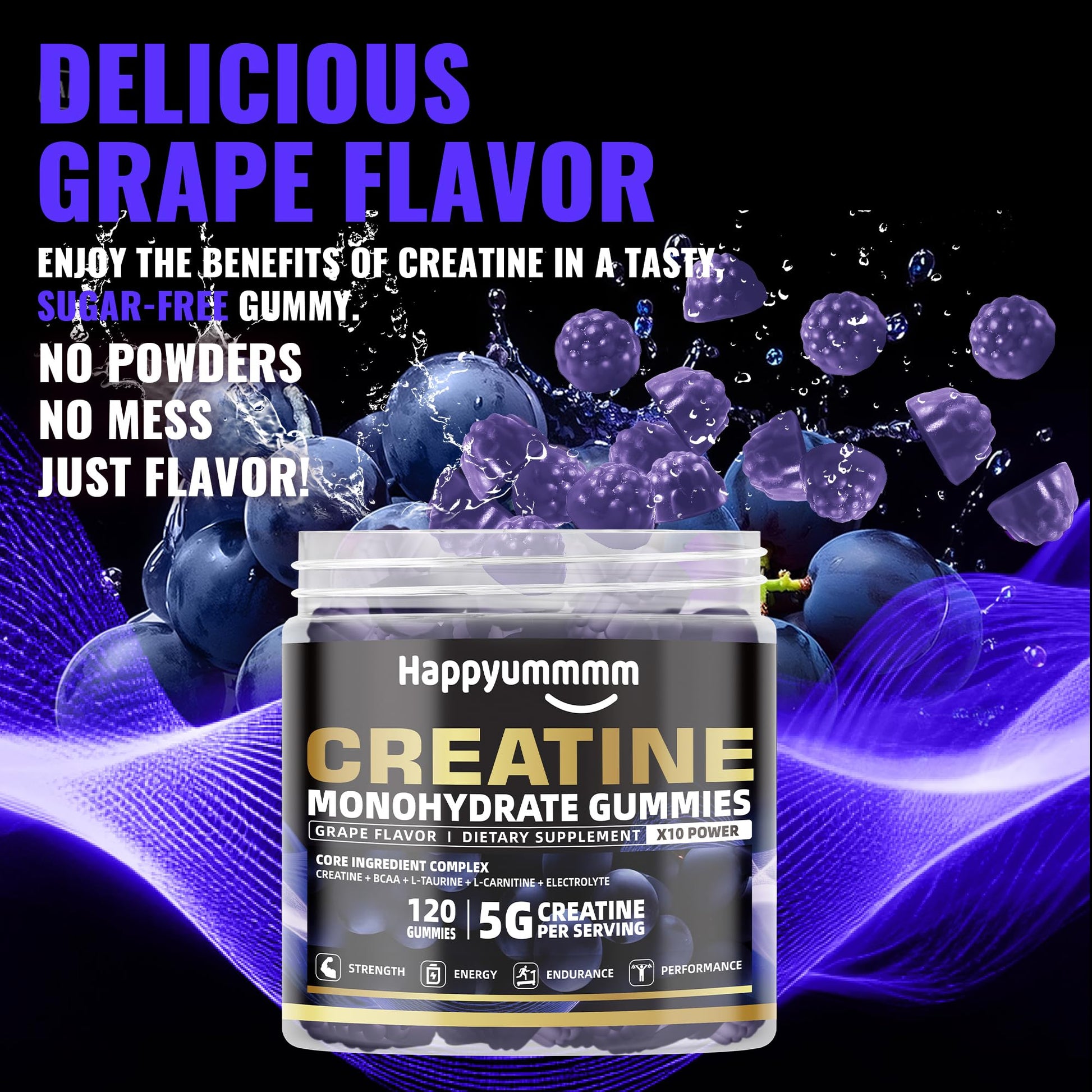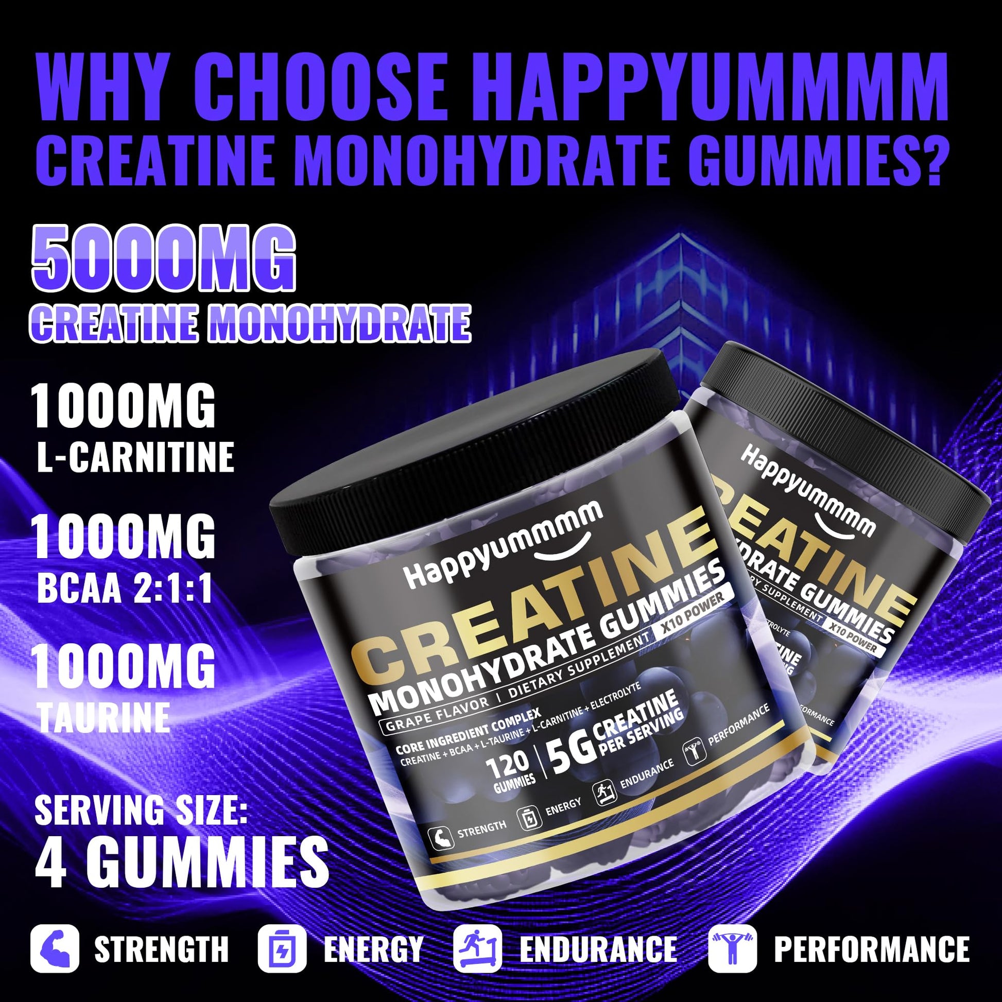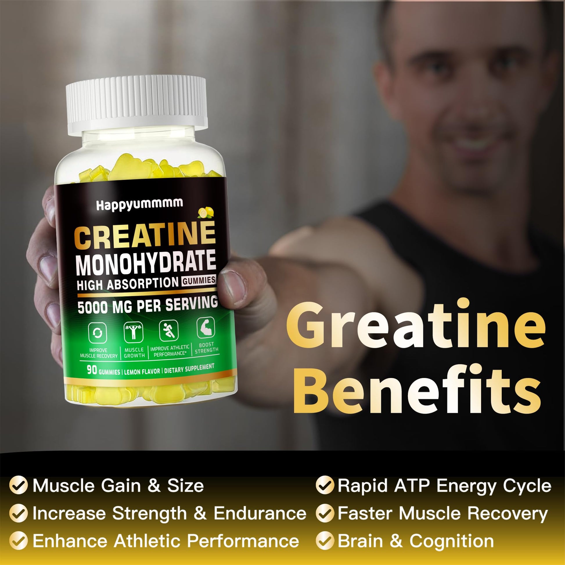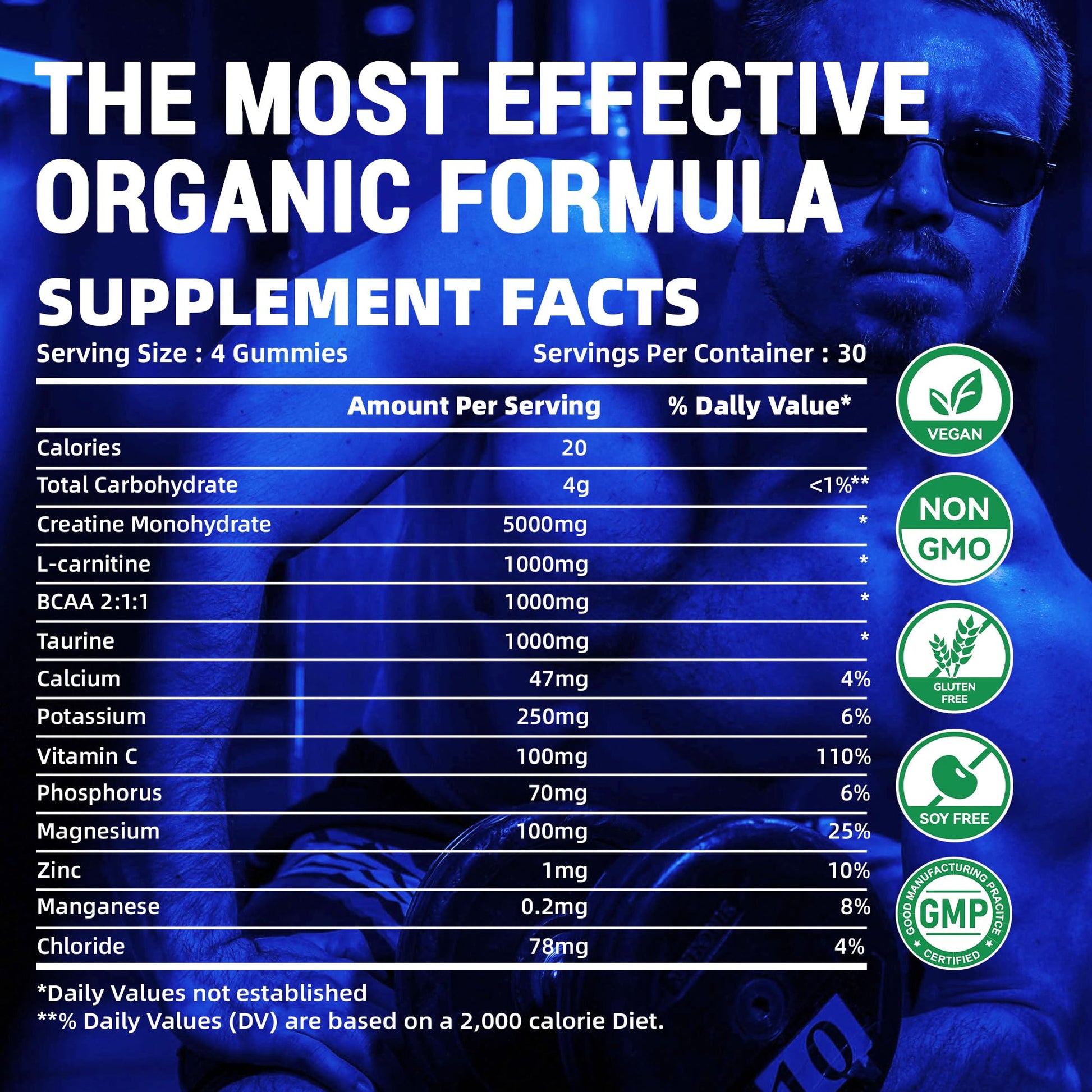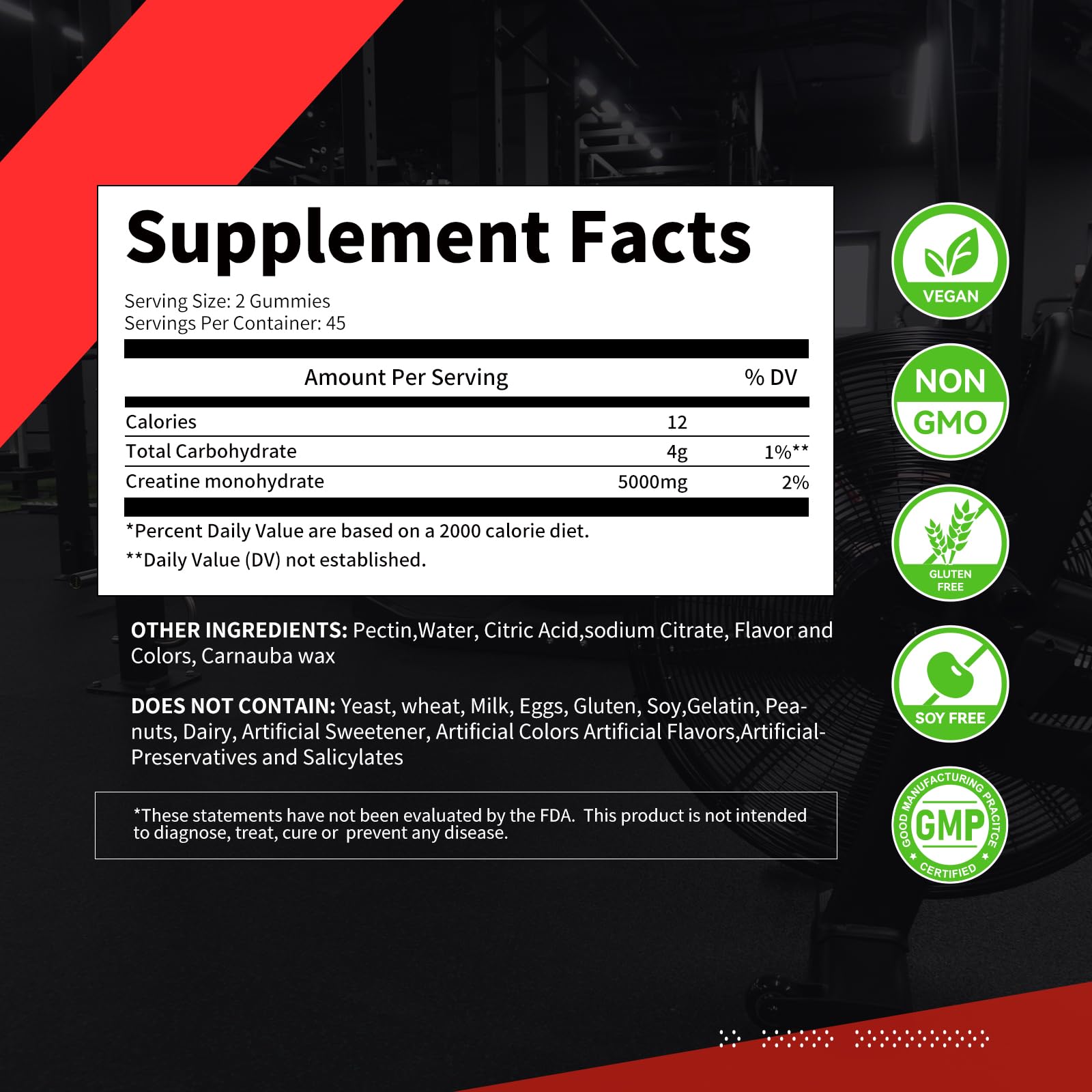 - [ Key Benefits]: Our Creatine monohydrate gummies are an easy way to consume, 2 gummies per serving, you can take it at any time, any place. It improved muscle strength, muscle recovery, improve endurance and energy boost. Suitable for a variety of users, and enjoyable taste.