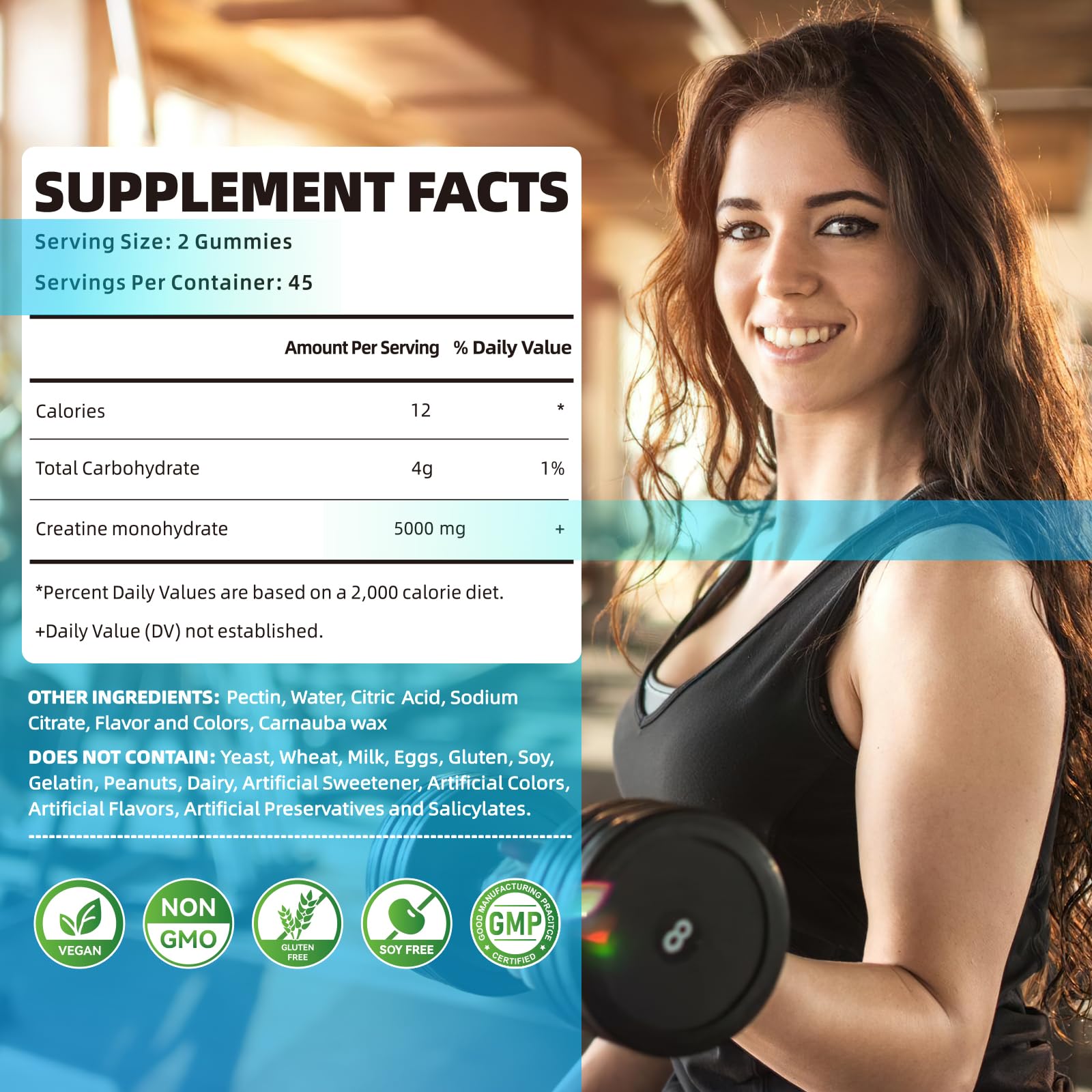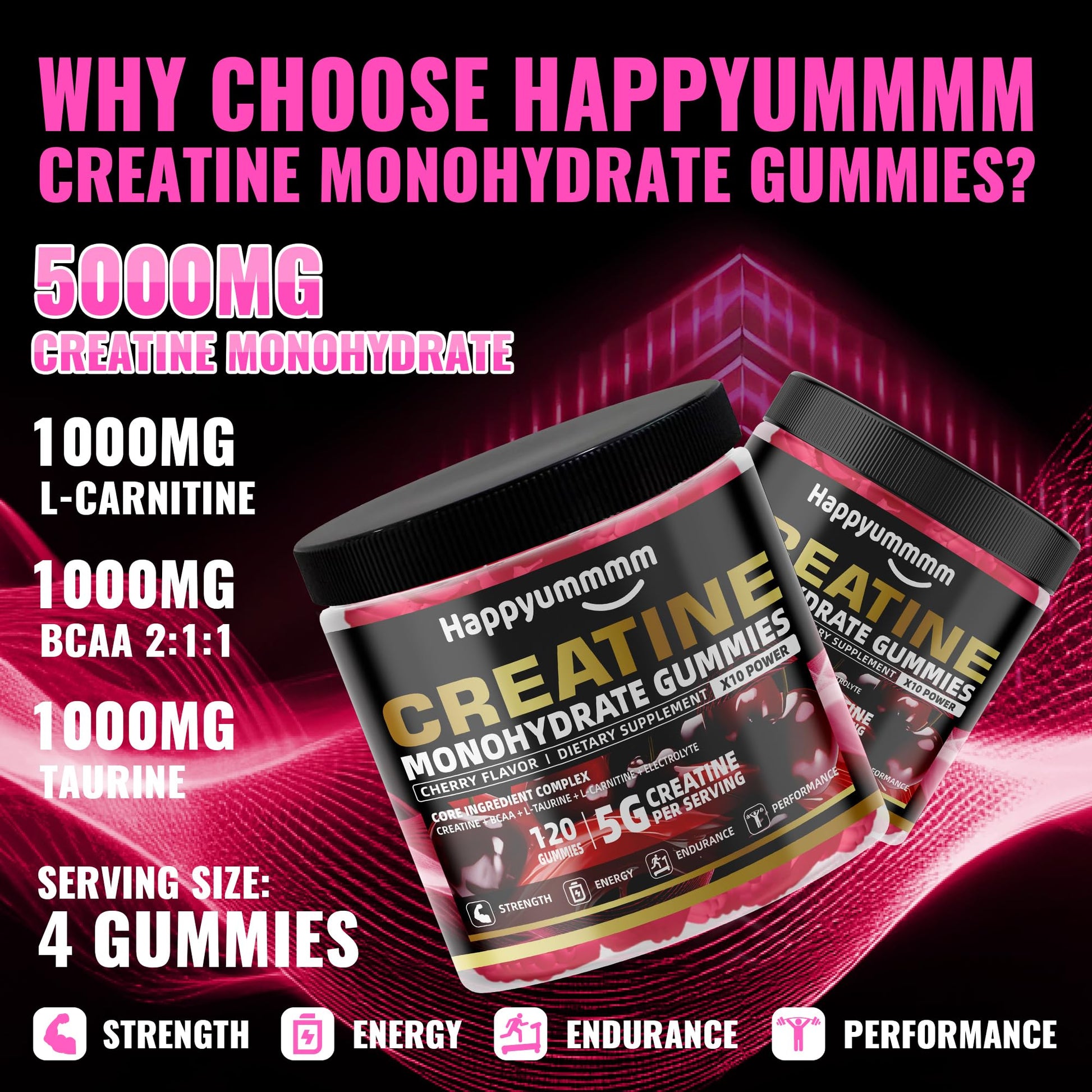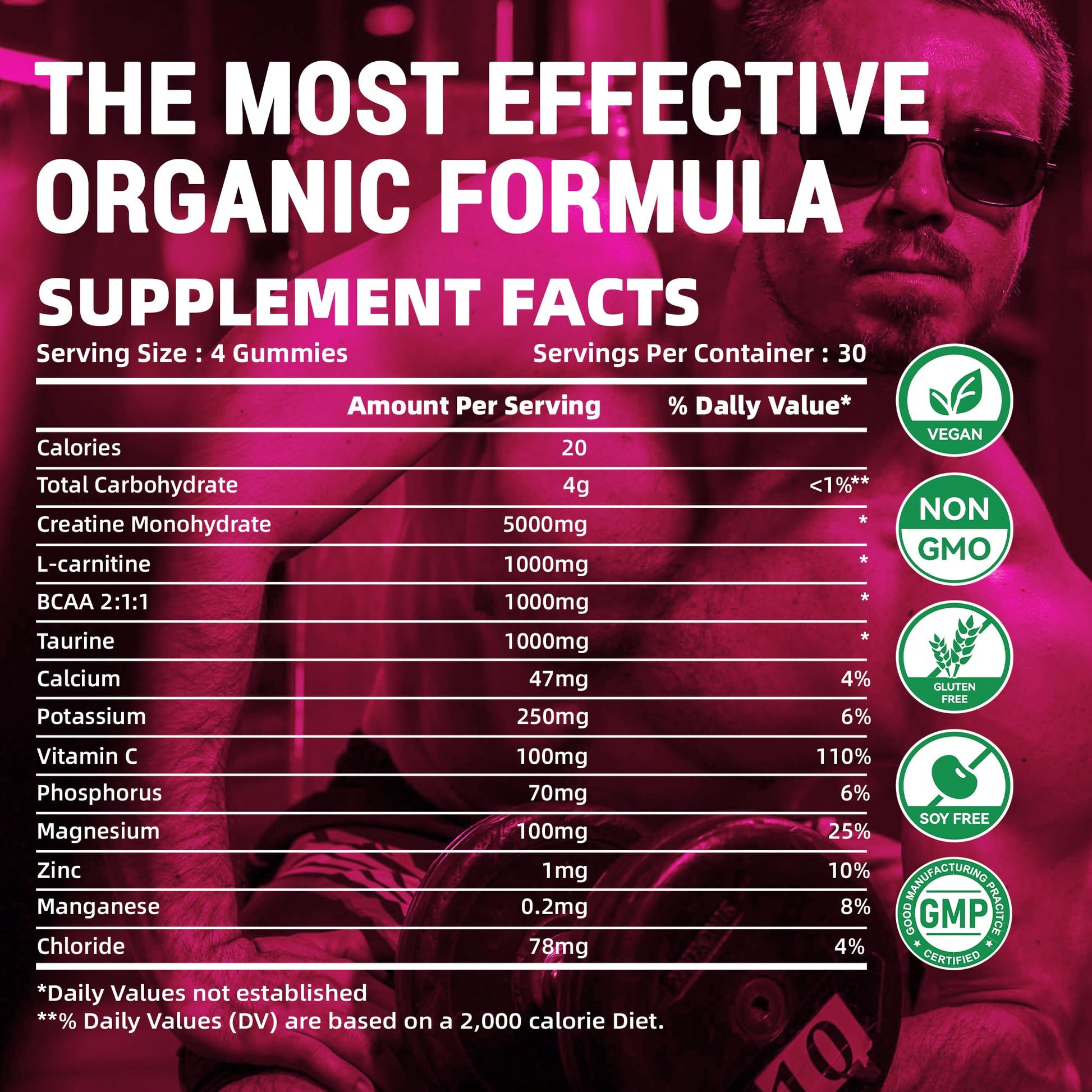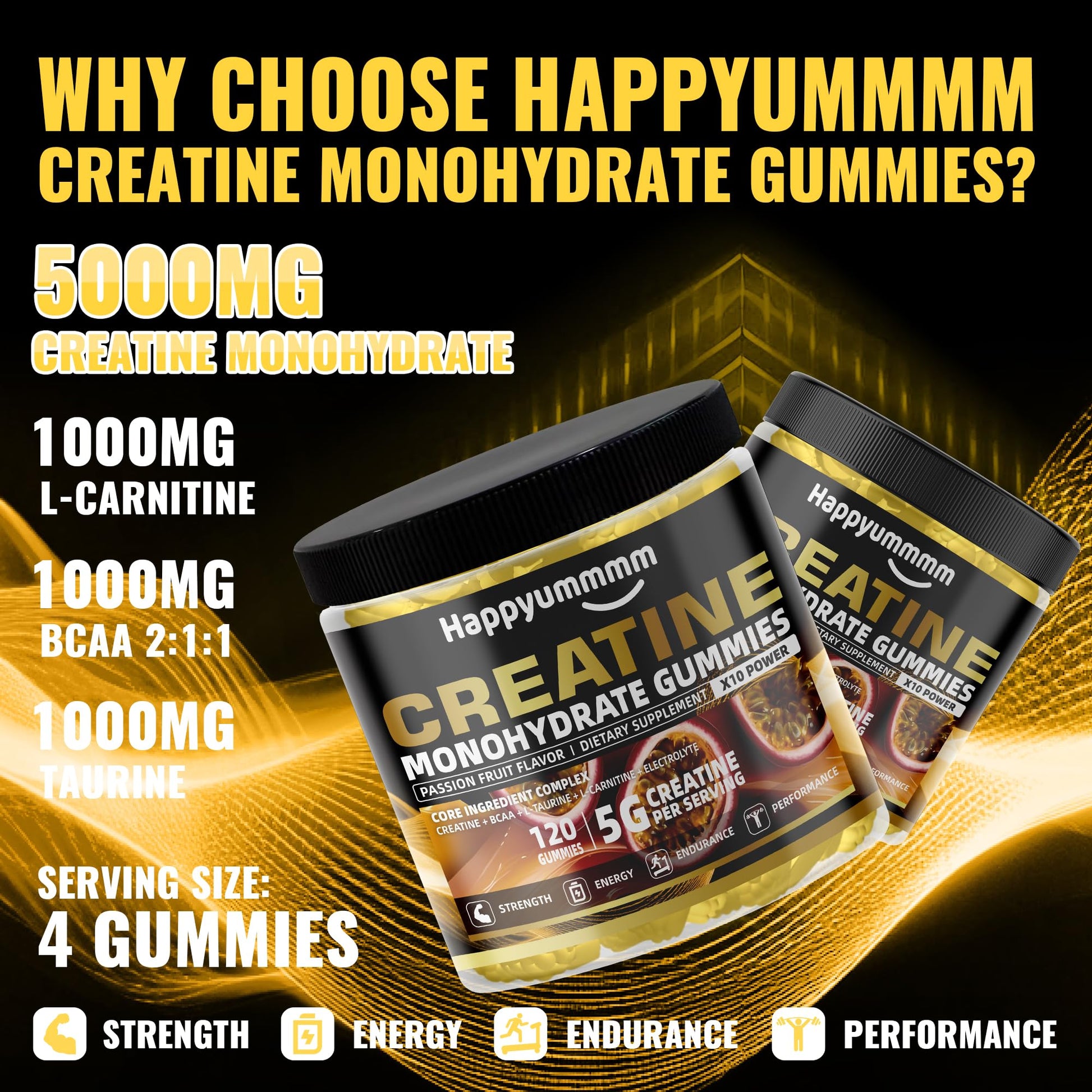 - [ Key Benefits]: Our Creatine monohydrate gummies are an easy way to consume, 2 gummies per serving, you can take it at any time, any place. It improved muscle strength, muscle recovery, improve endurance and energy boost. Suitable for a variety of users, and enjoyable taste.