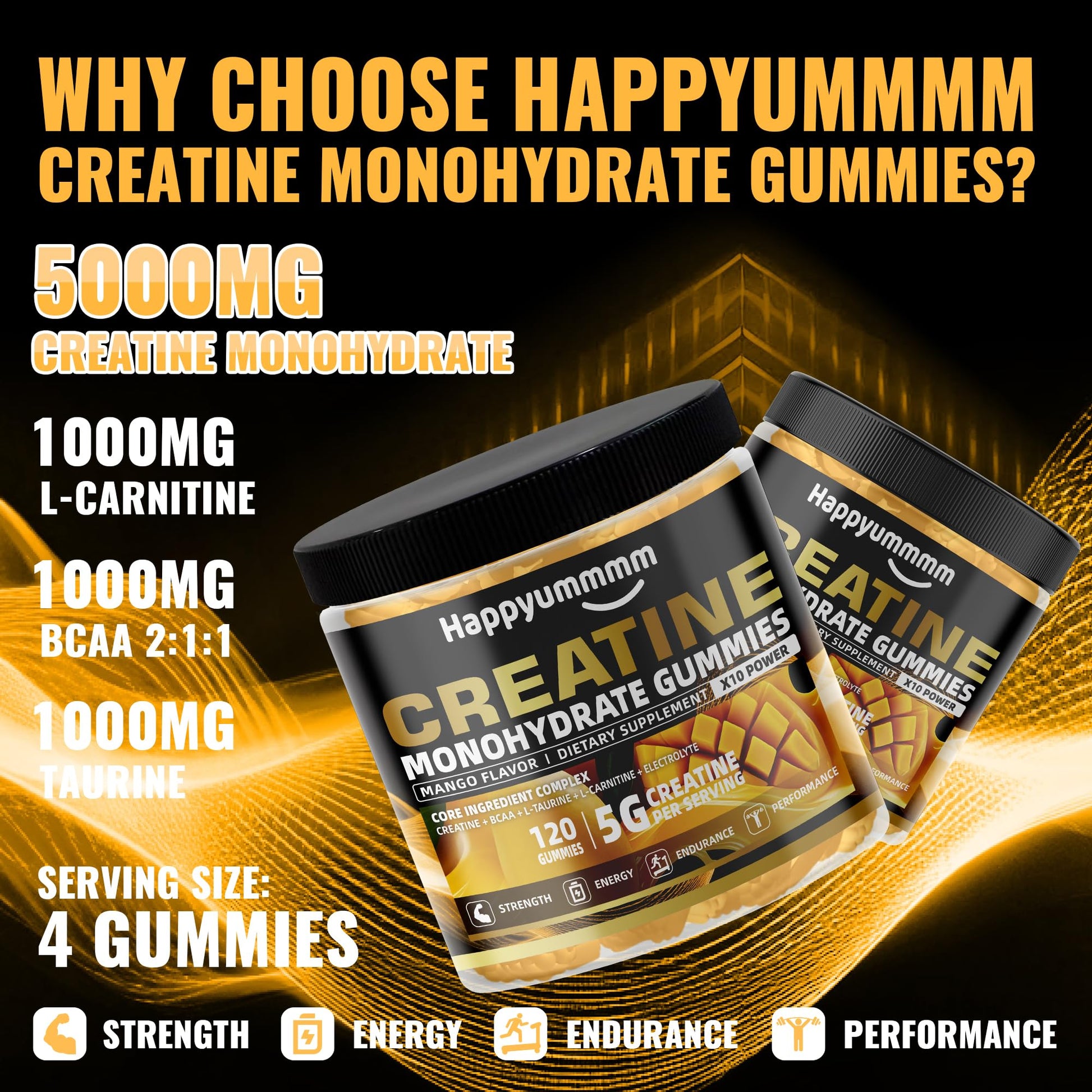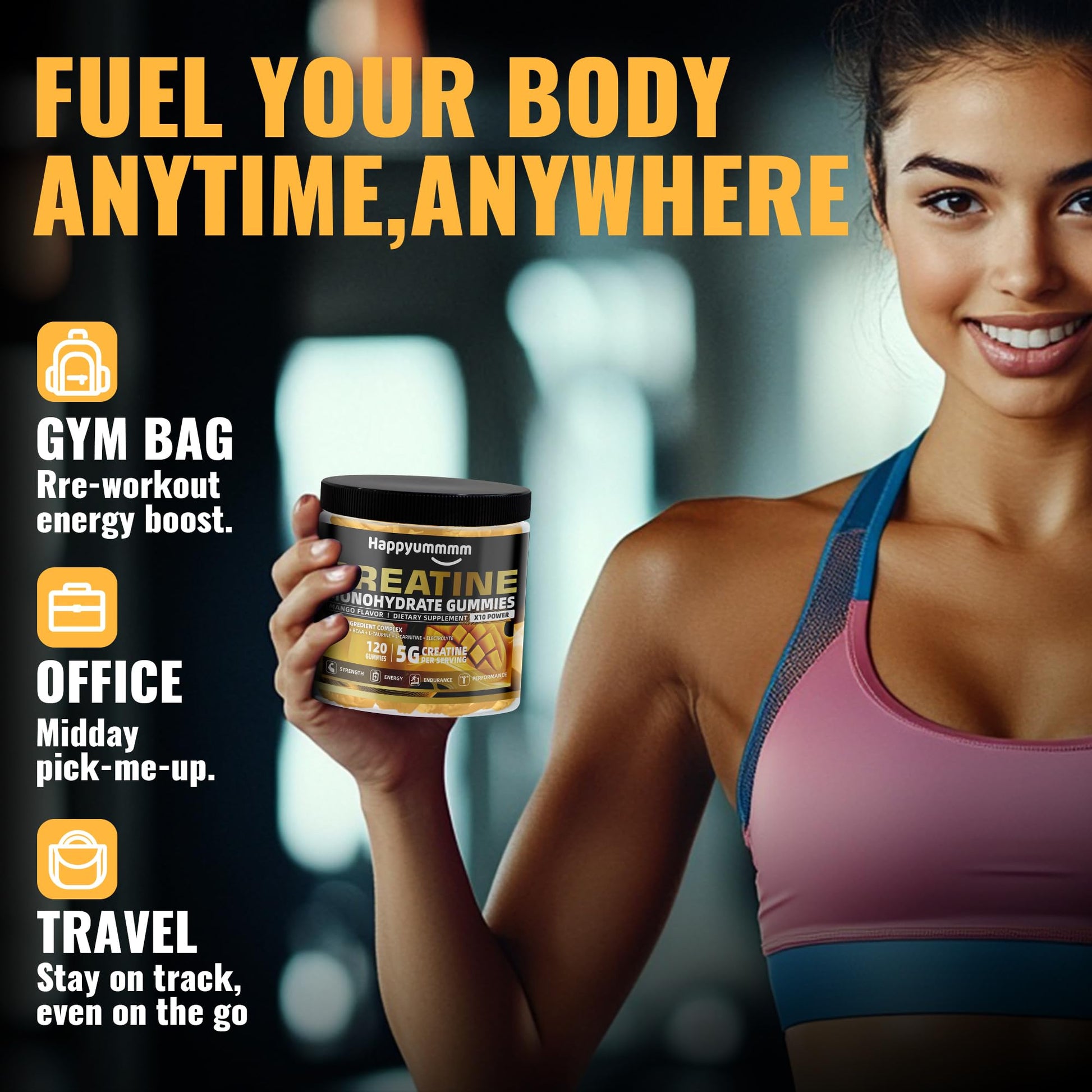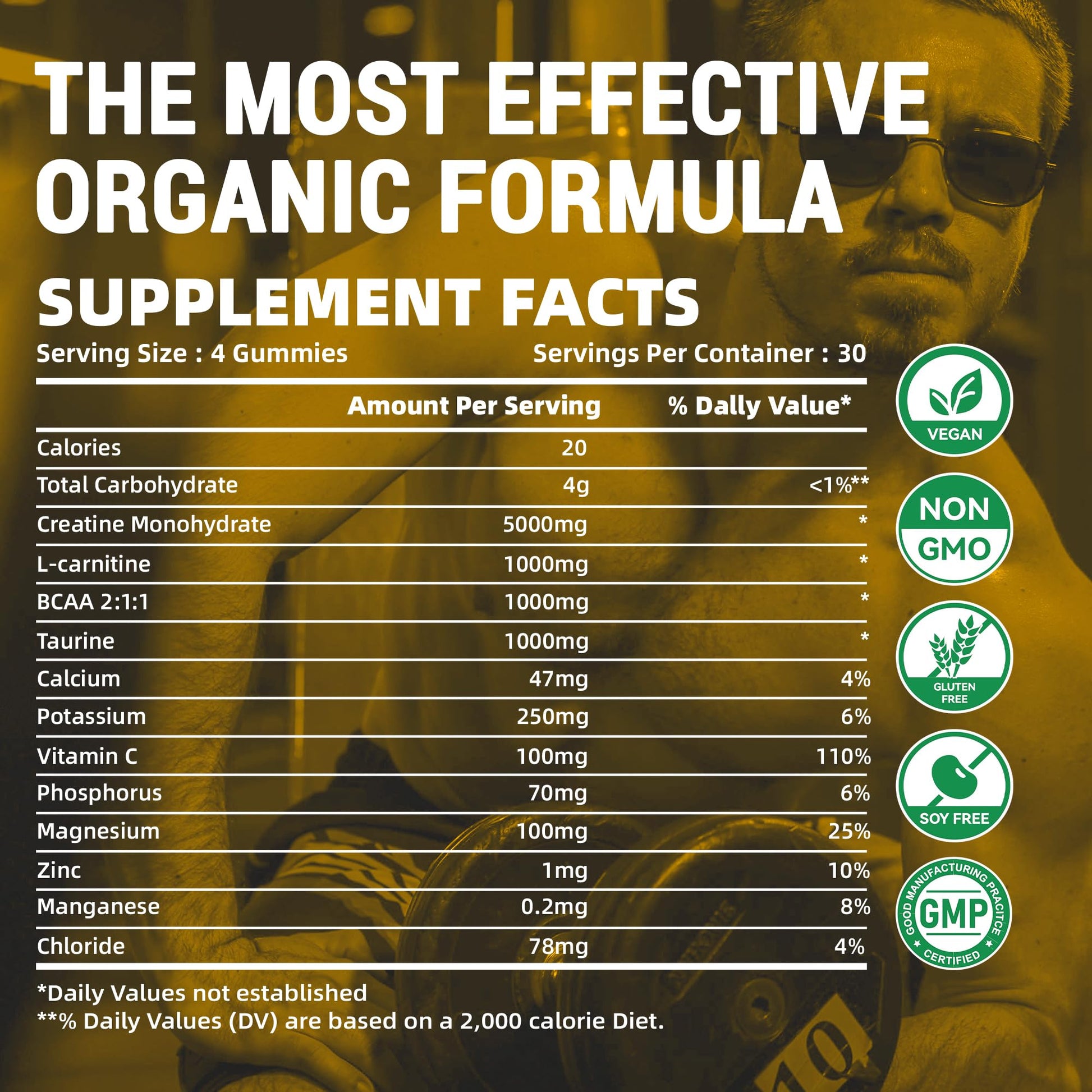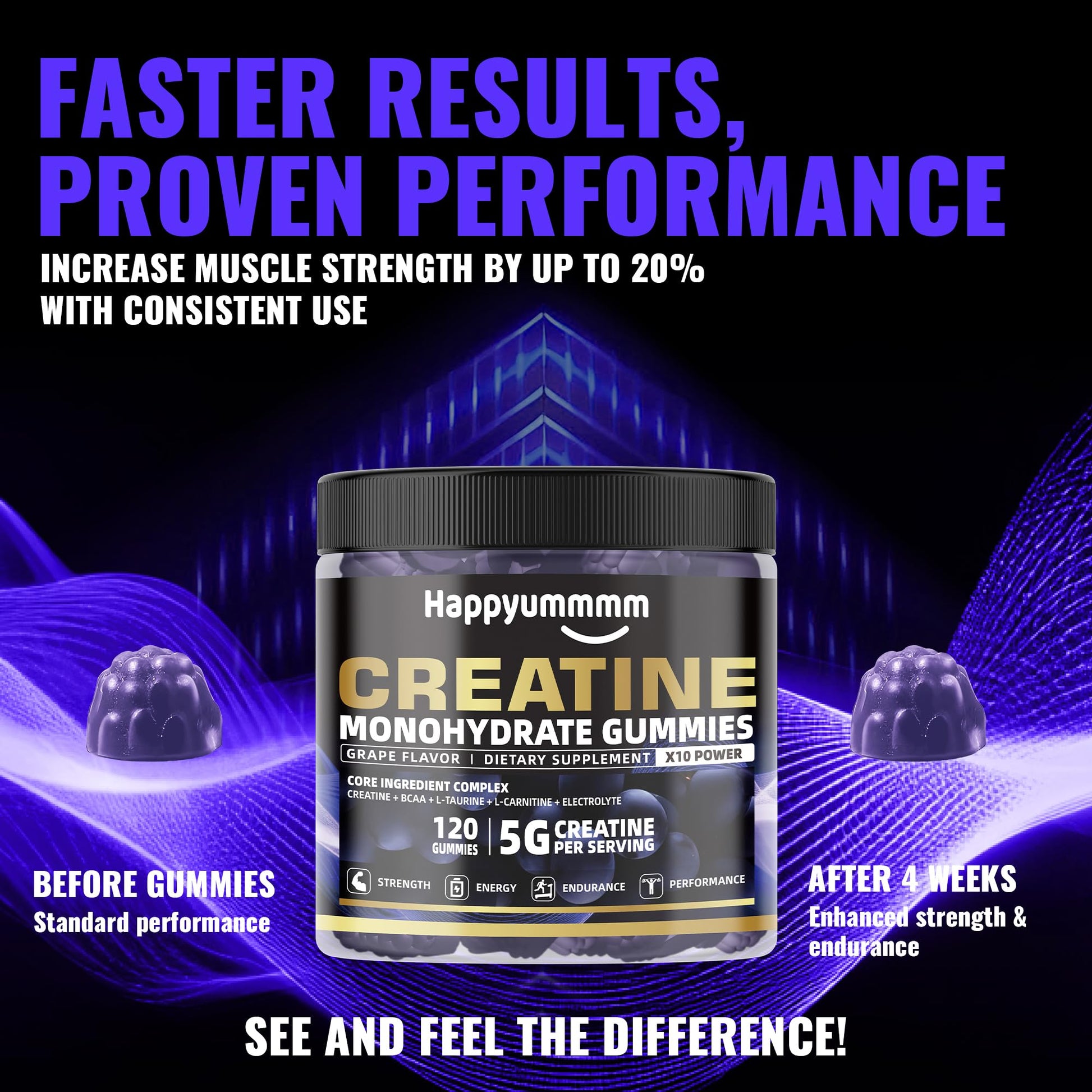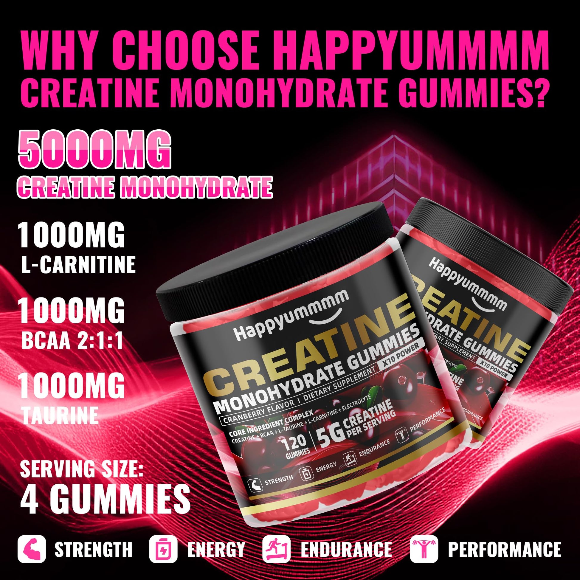 - [ Key Benefits]: Our Creatine monohydrate gummies are an easy way to consume, 2 gummies per serving, you can take it at any time, any place. It improved muscle strength, muscle recovery, improve endurance and energy boost. Suitable for a variety of users, and enjoyable taste.