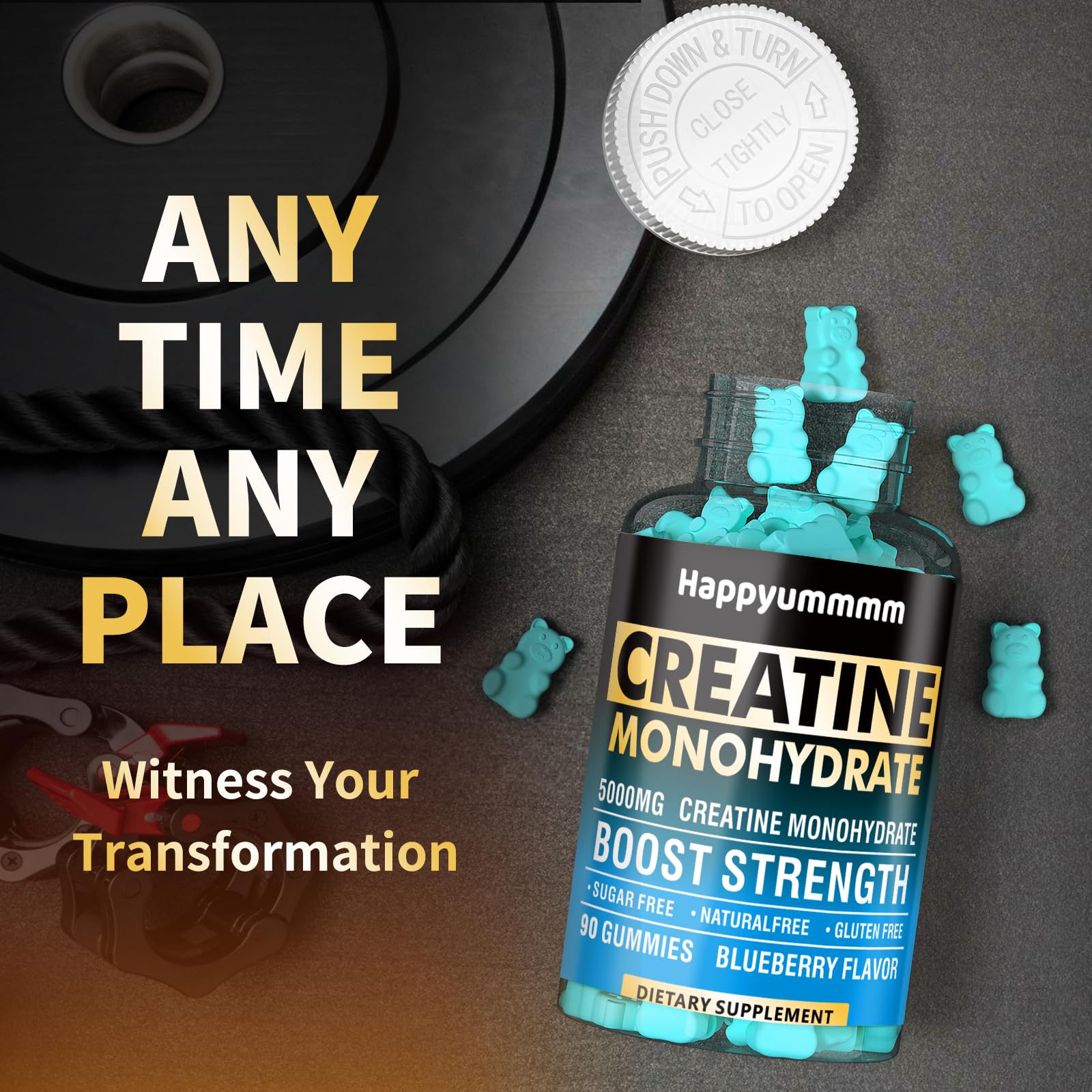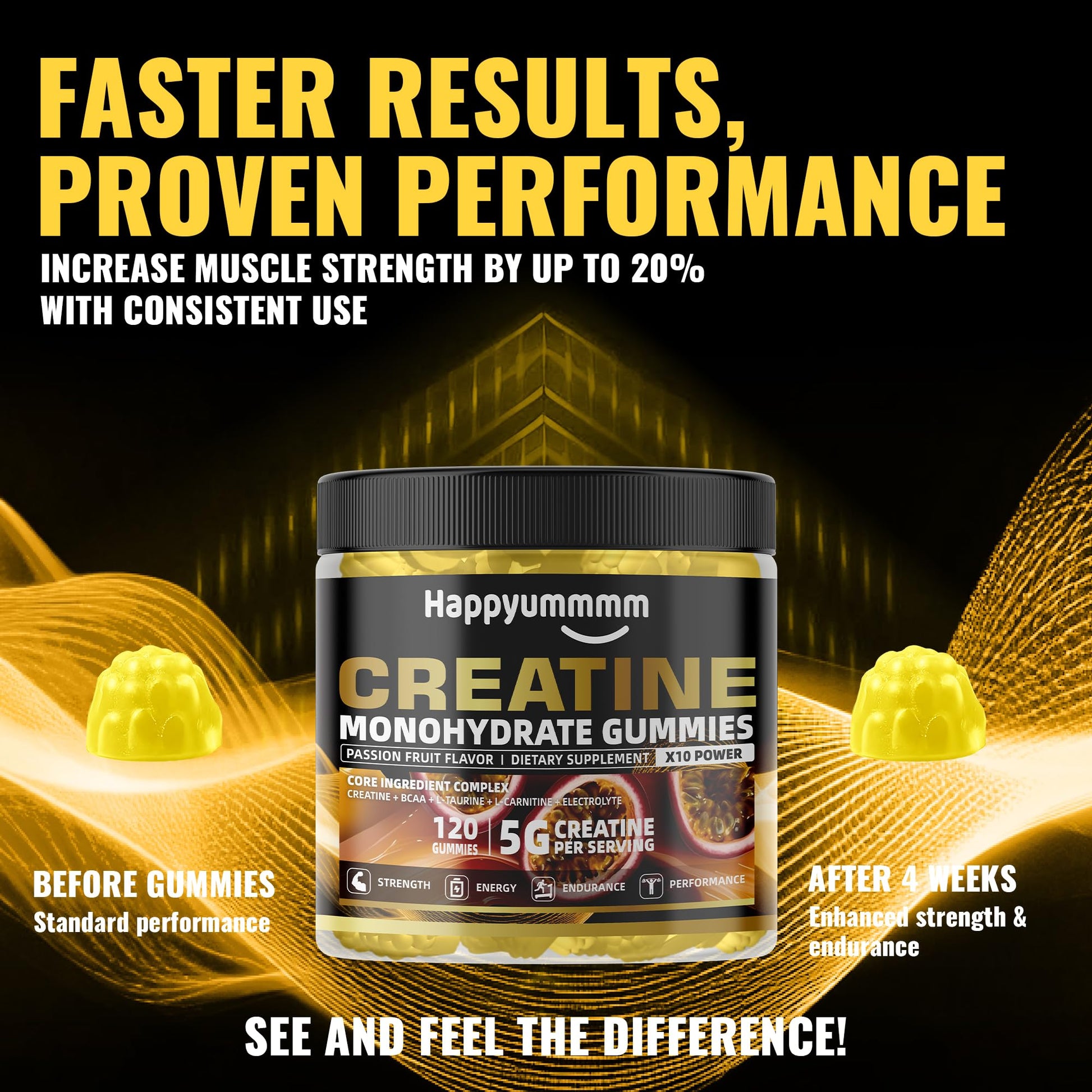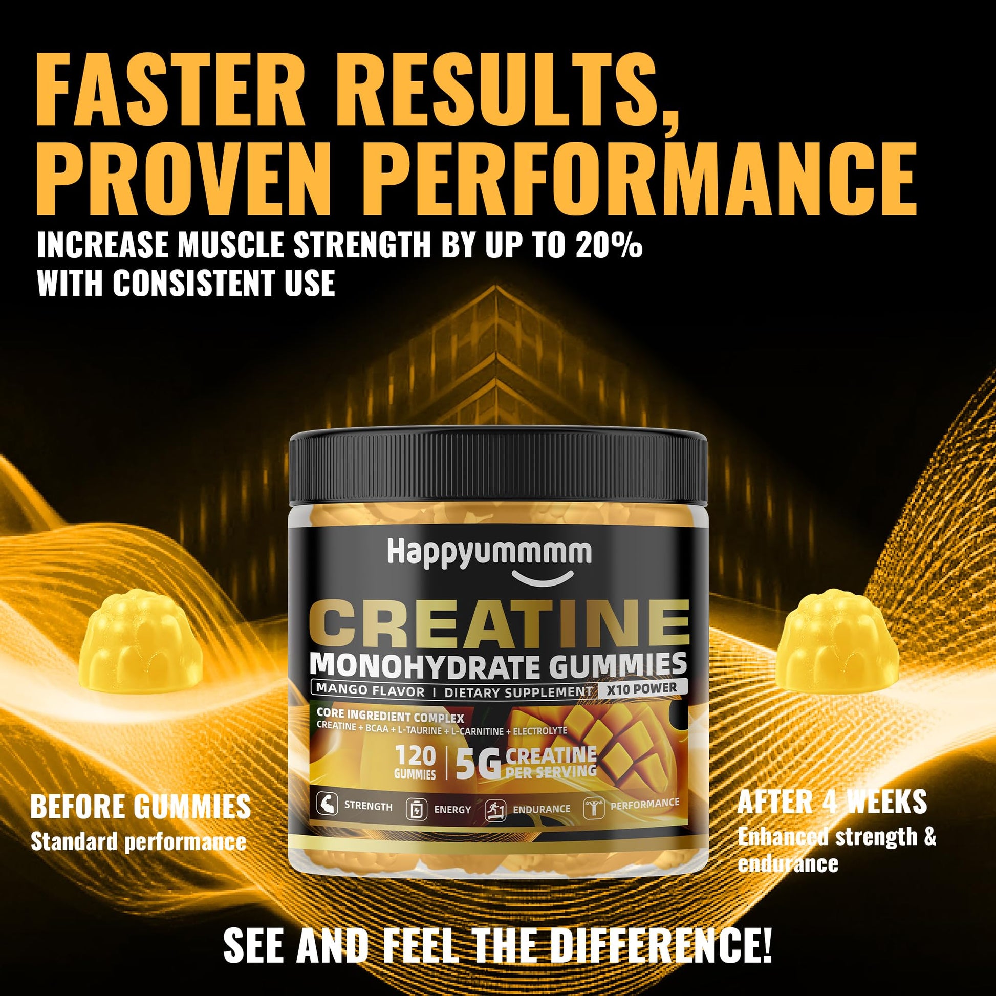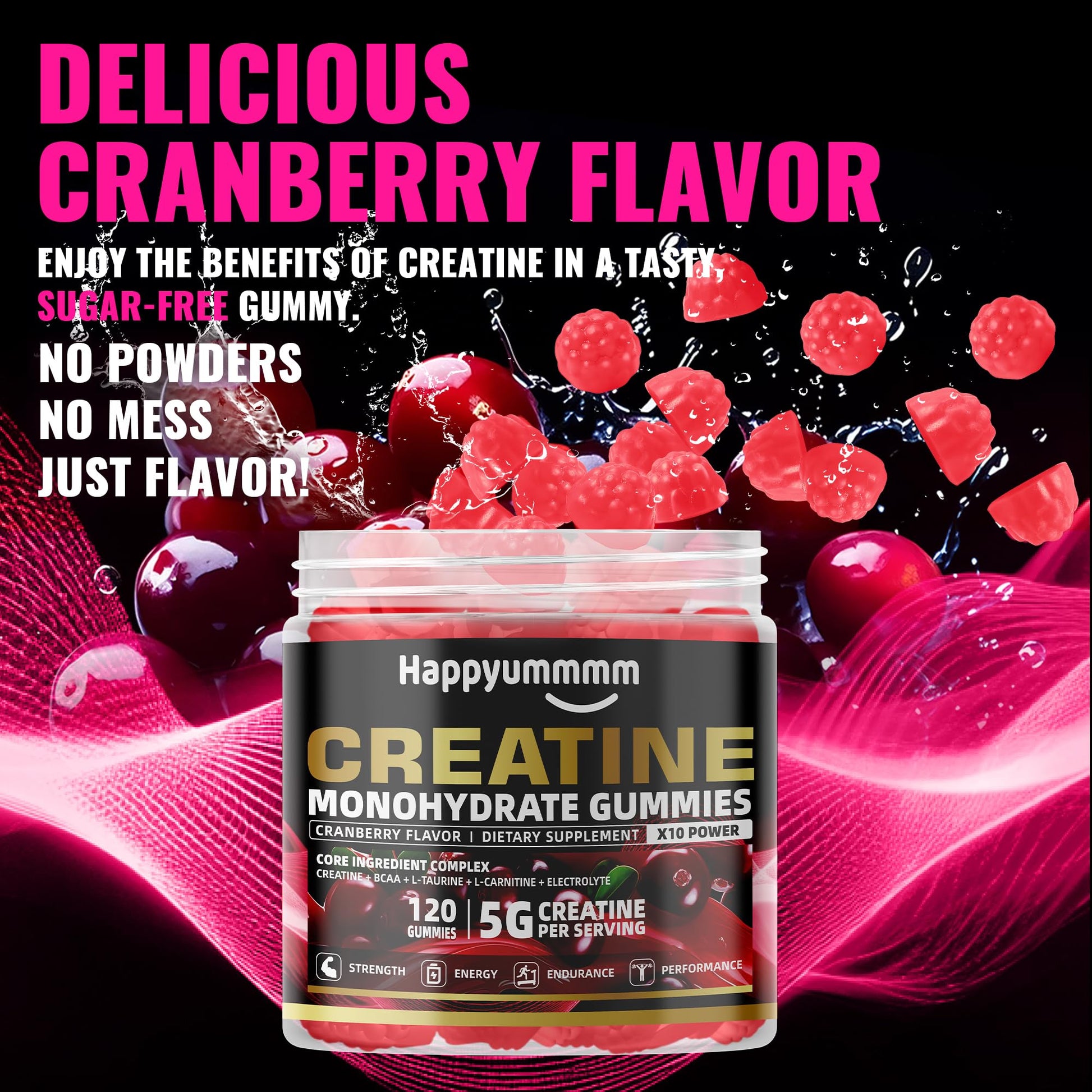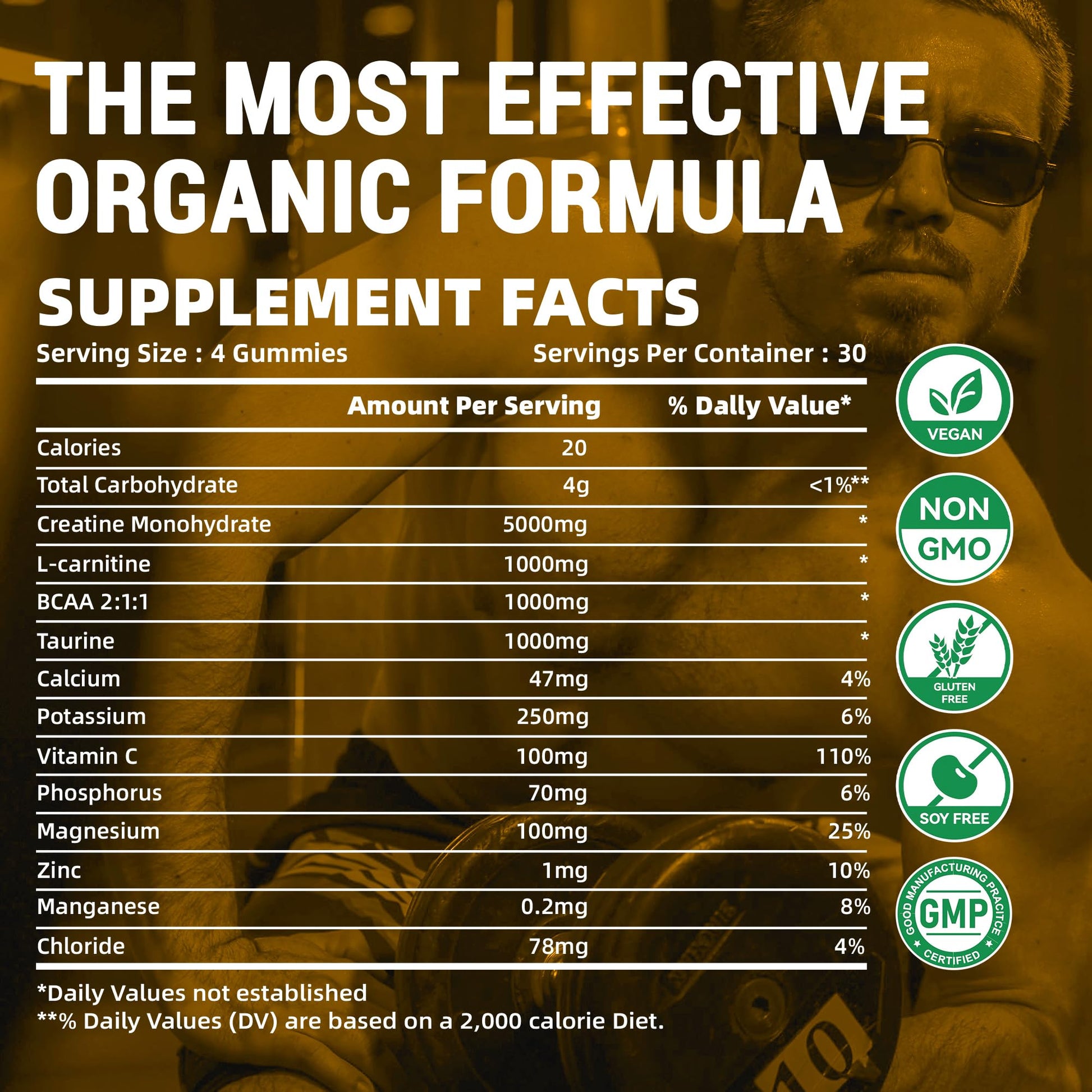 - [ Key Benefits]: Our Creatine monohydrate gummies are an easy way to consume, 2 gummies per serving, you can take it at any time, any place. It improved muscle strength, muscle recovery, improve endurance and energy boost. Suitable for a variety of users, and enjoyable taste.