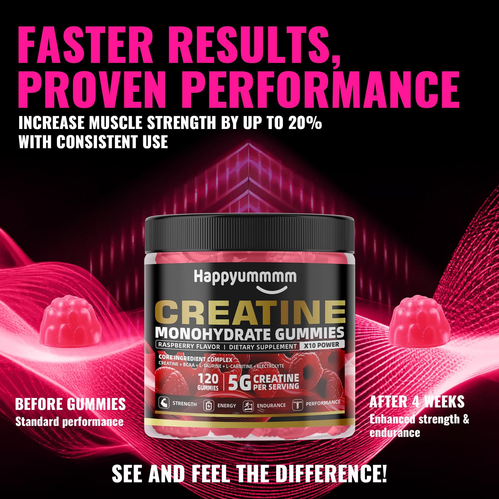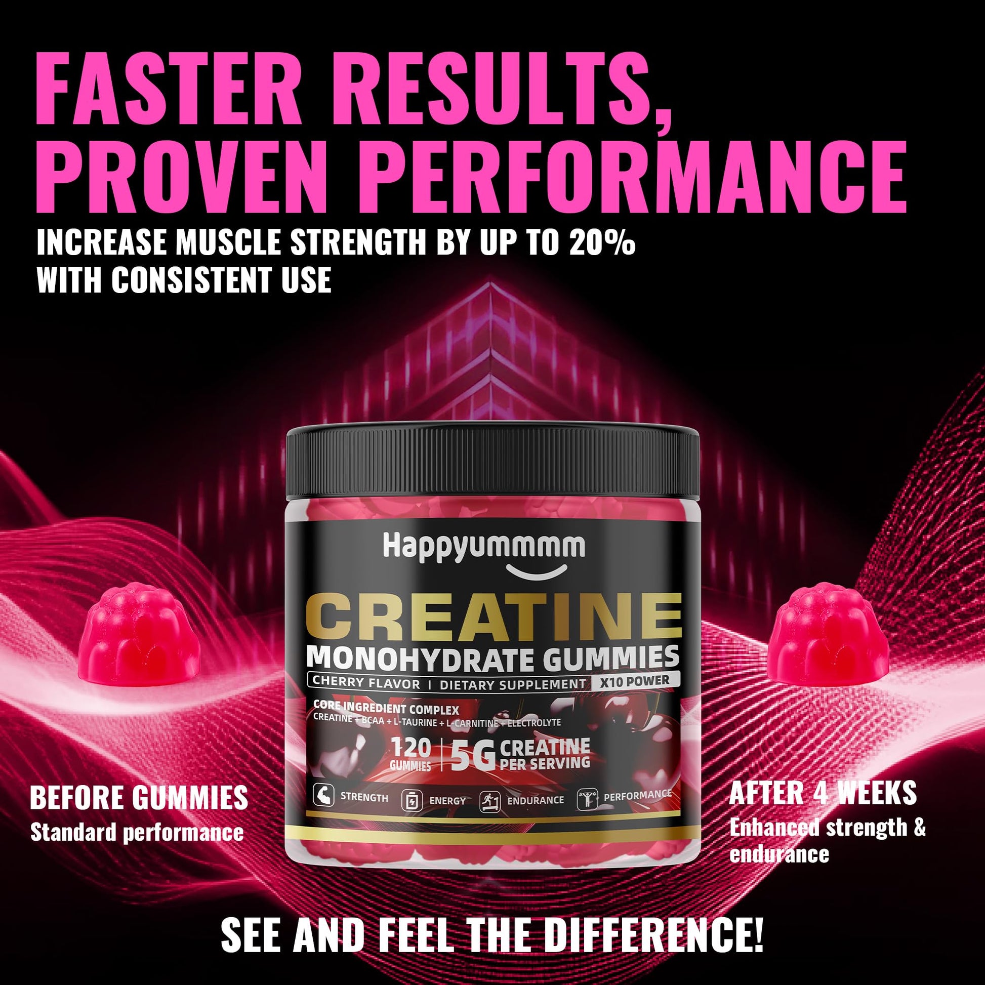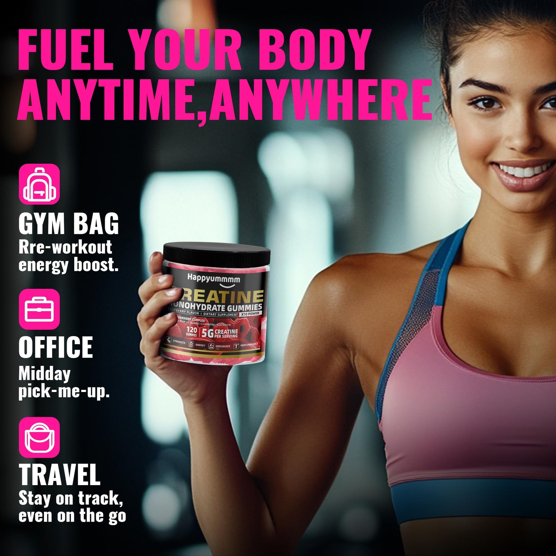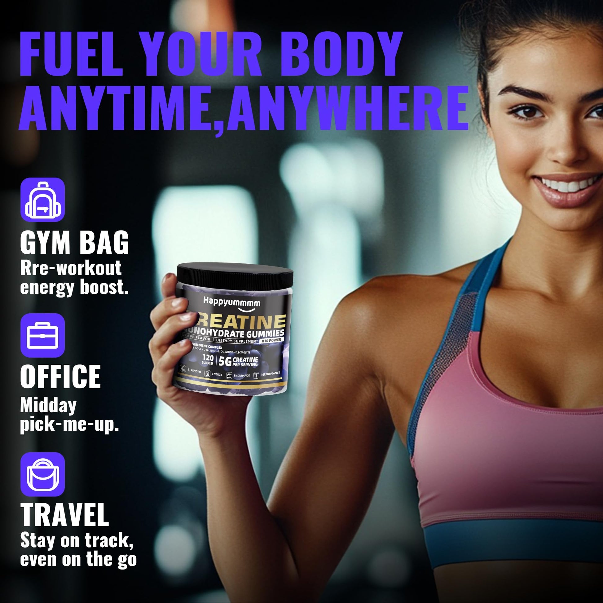 - [ Key Benefits]: Our Creatine monohydrate gummies are an easy way to consume, 2 gummies per serving, you can take it at any time, any place. It improved muscle strength, muscle recovery, improve endurance and energy boost. Suitable for a variety of users, and enjoyable taste.