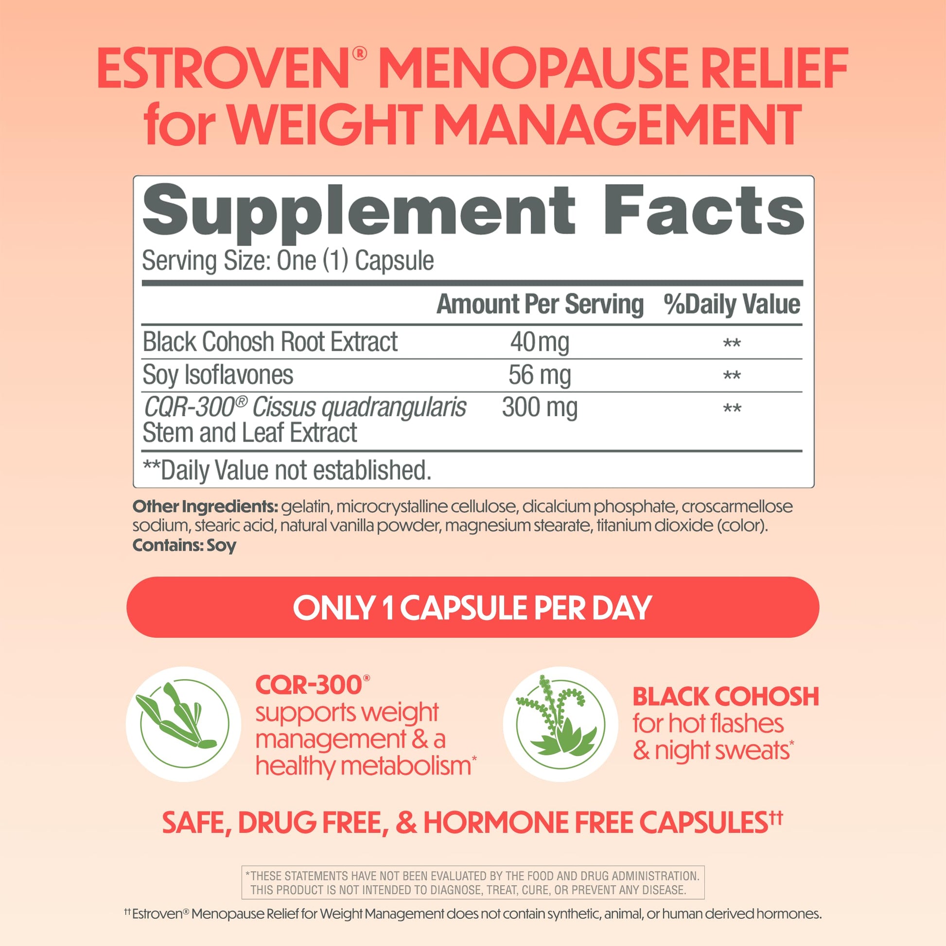 - NATURALLY-SOURCED INGREDIENTS: Estroven weight management menopause relief is formulated with black cohosh, soy isoflavones and a metabolic herbal extract that helps effectively manage weight and promote a healthy metabolism in menopausal women*