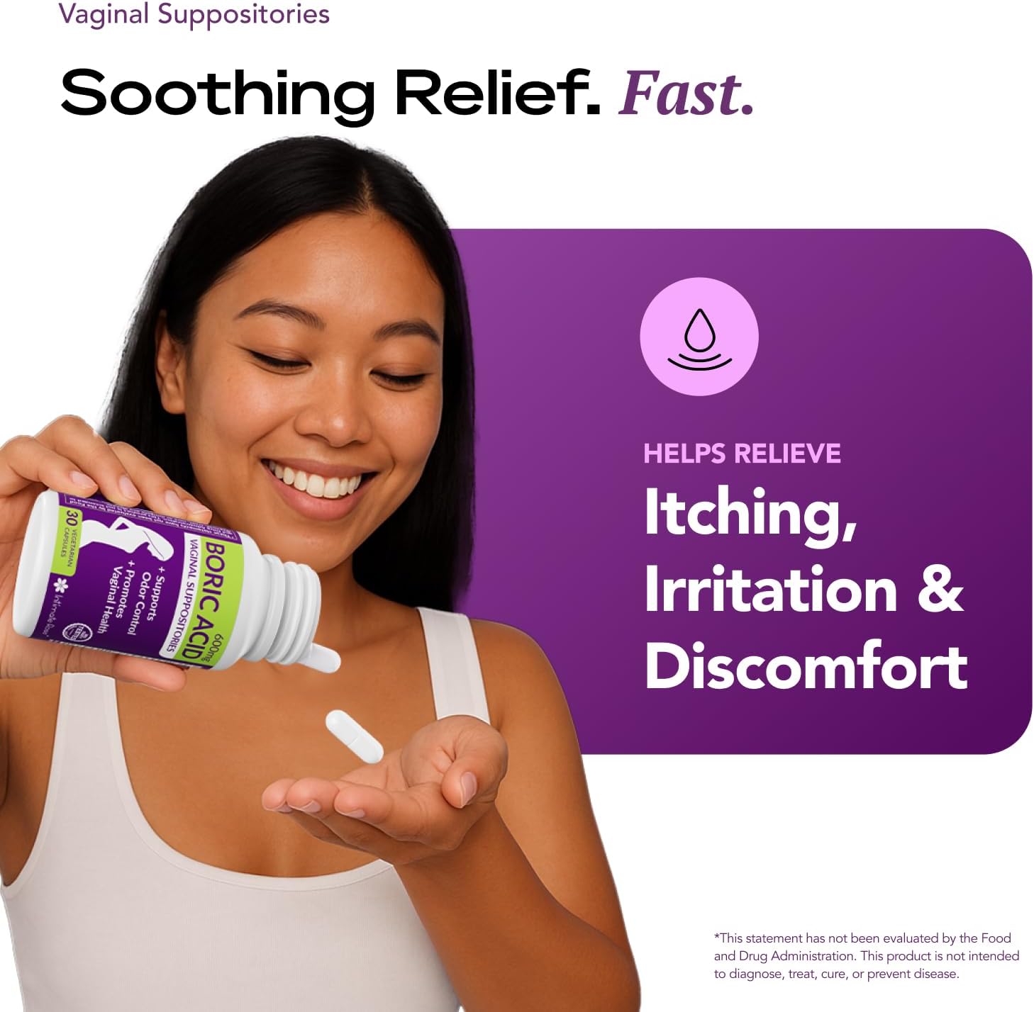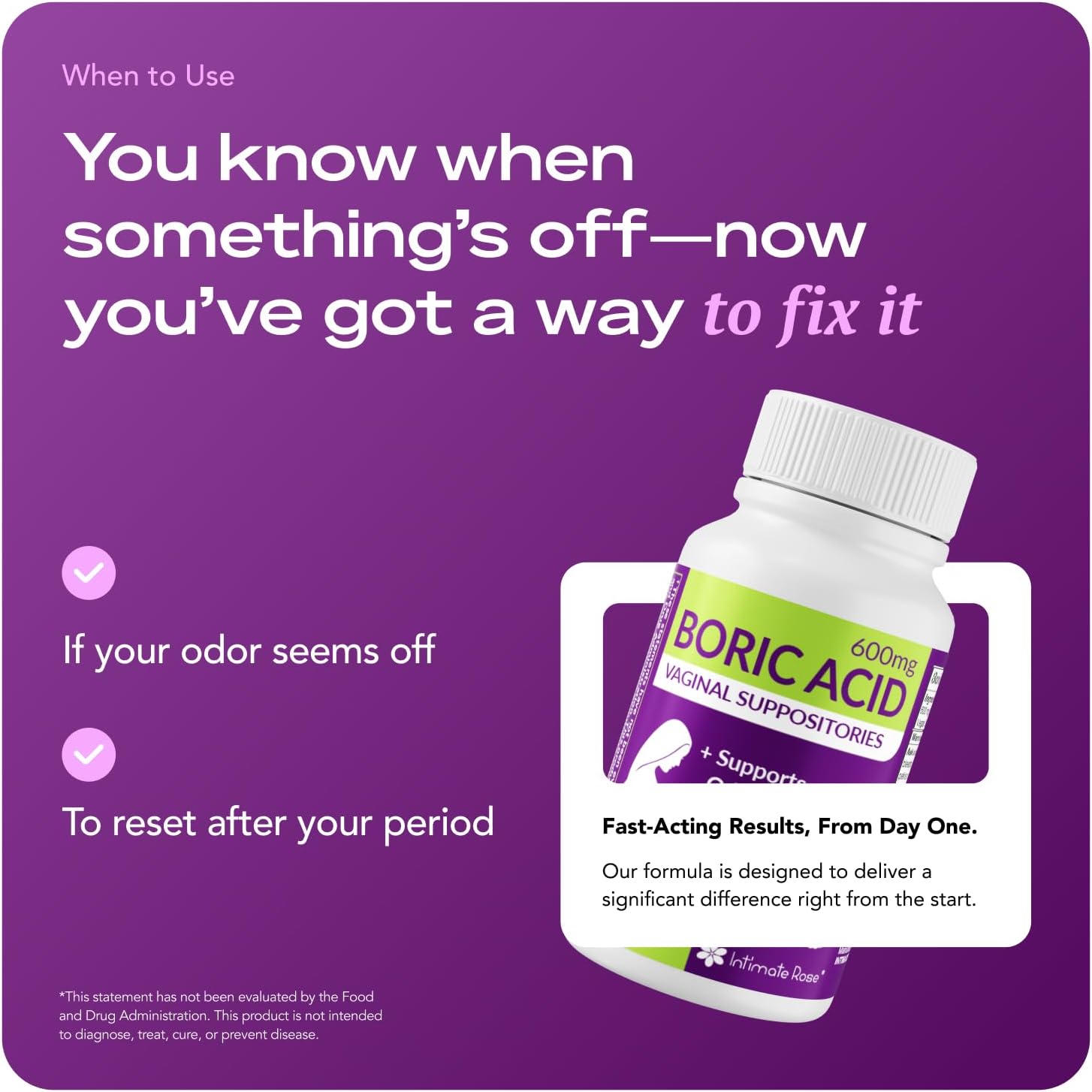 - High-Potency Formula: Each suppository contains 600mg of pure boric acid, precisely formulated to restore and maintain vaginal balance, ensuring consistent freshness and efficacy.