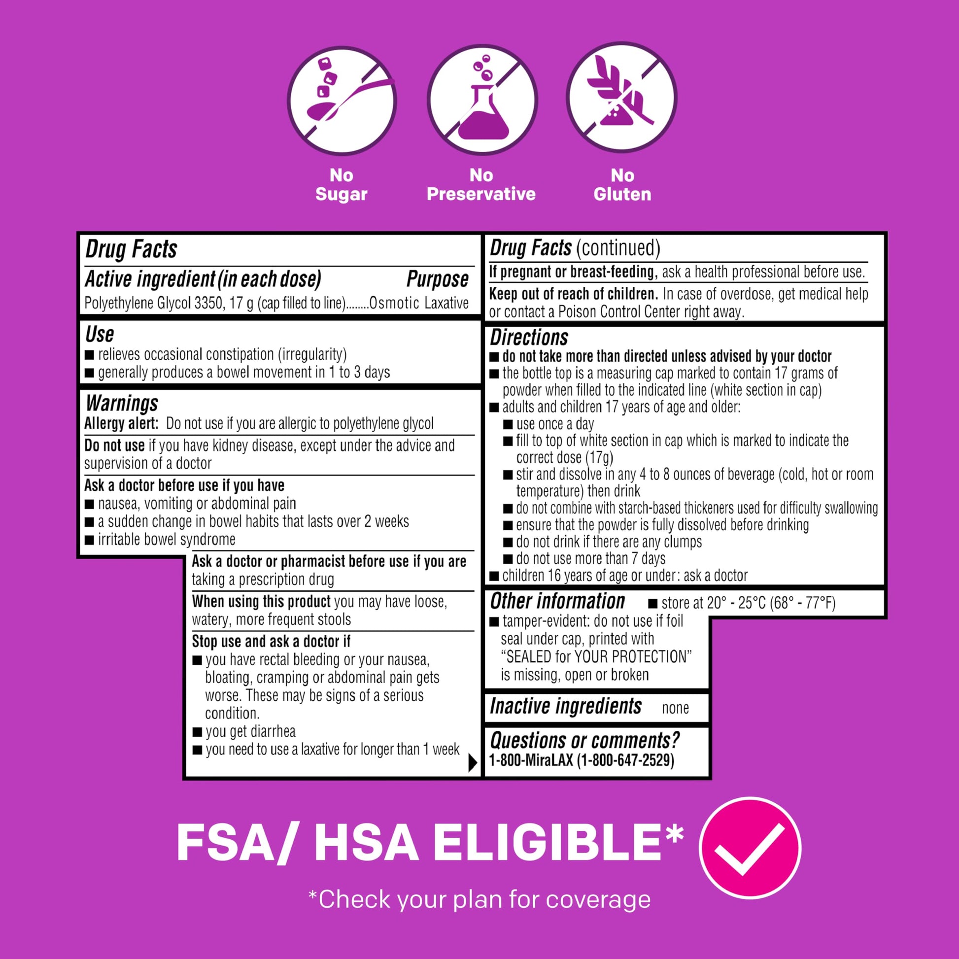 - NO HARSH SIDE EFFECTS: MiraLAX helps relieve your occasional constipation without causing gas, bloating, cramping, or sudden urgency