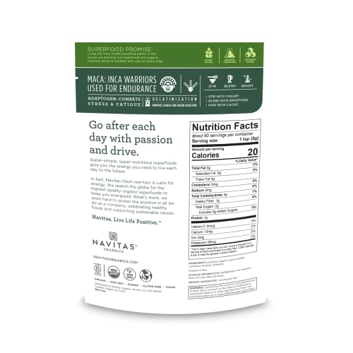 Navitas Organics Maca Powder – 100% Gelatinized Peruvian Maca for Adaptogen Smoothies, Lattes, Baking & More – Energize & Balance - USDA Organic, Non GMO, Vegan, Gluten Free (4oz. Bag, 23 Servings)