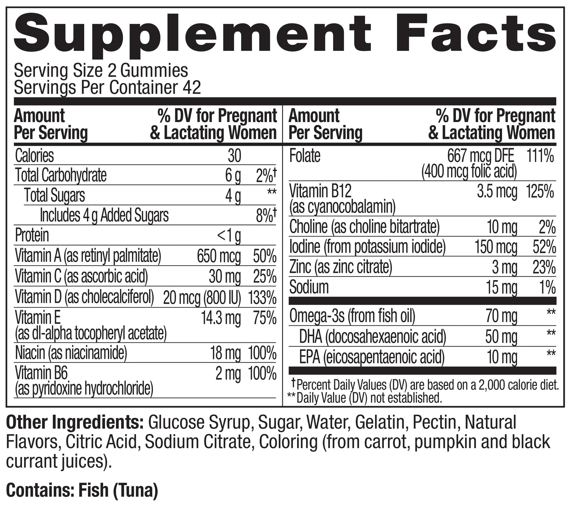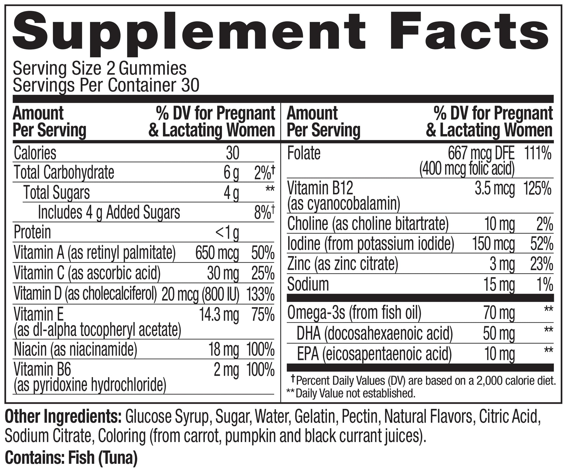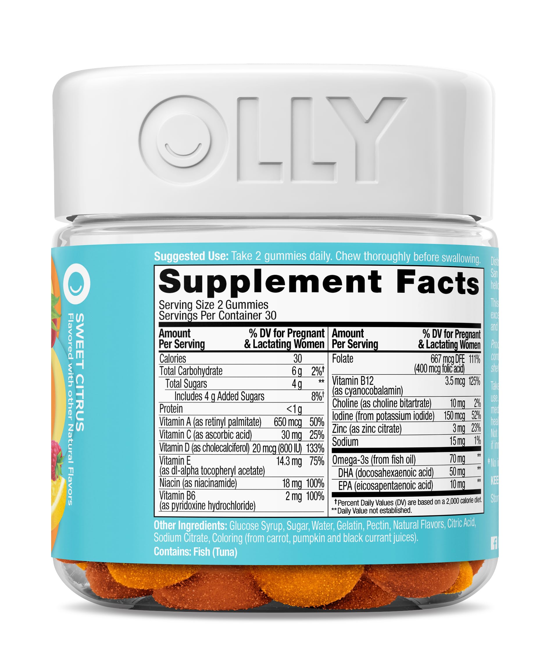 Say hello to your body’s (and your baby’s new BFF): OLLY’s The Essential Prenatal Folic Acid + DHA. Whether it’s before, during or after your pregnancy, this nurturing blend provides essential nutrients plus Omega-3 DHA (the good fat that mom and baby need daily) to help keep you healthy and energized. OLLY prenatal gummies also deliver the good stuff to your precious cargo.* Folic Acid is a B vitamin that supports growth and development of your little one. DHA is an essential fatty acid that supports healthy brain and eye development for baby (extracted from a purified marine source), and immune supportive nutrients like vitamins C and E help support overall health and wellness during pregnancy.* Good health is at the center of everything we do. That's why we’ve made it our mission to make nutrition easy to understand. We do it by crafting products that are as effective as they are delicious—because we know when something feels good, you’re more likely to do it.* Contains: Fish (tuna). *These statements have not been evaluated by the Food and Drug Administration. This product is not intended to diagnose, treat, cure or prevent any disease.