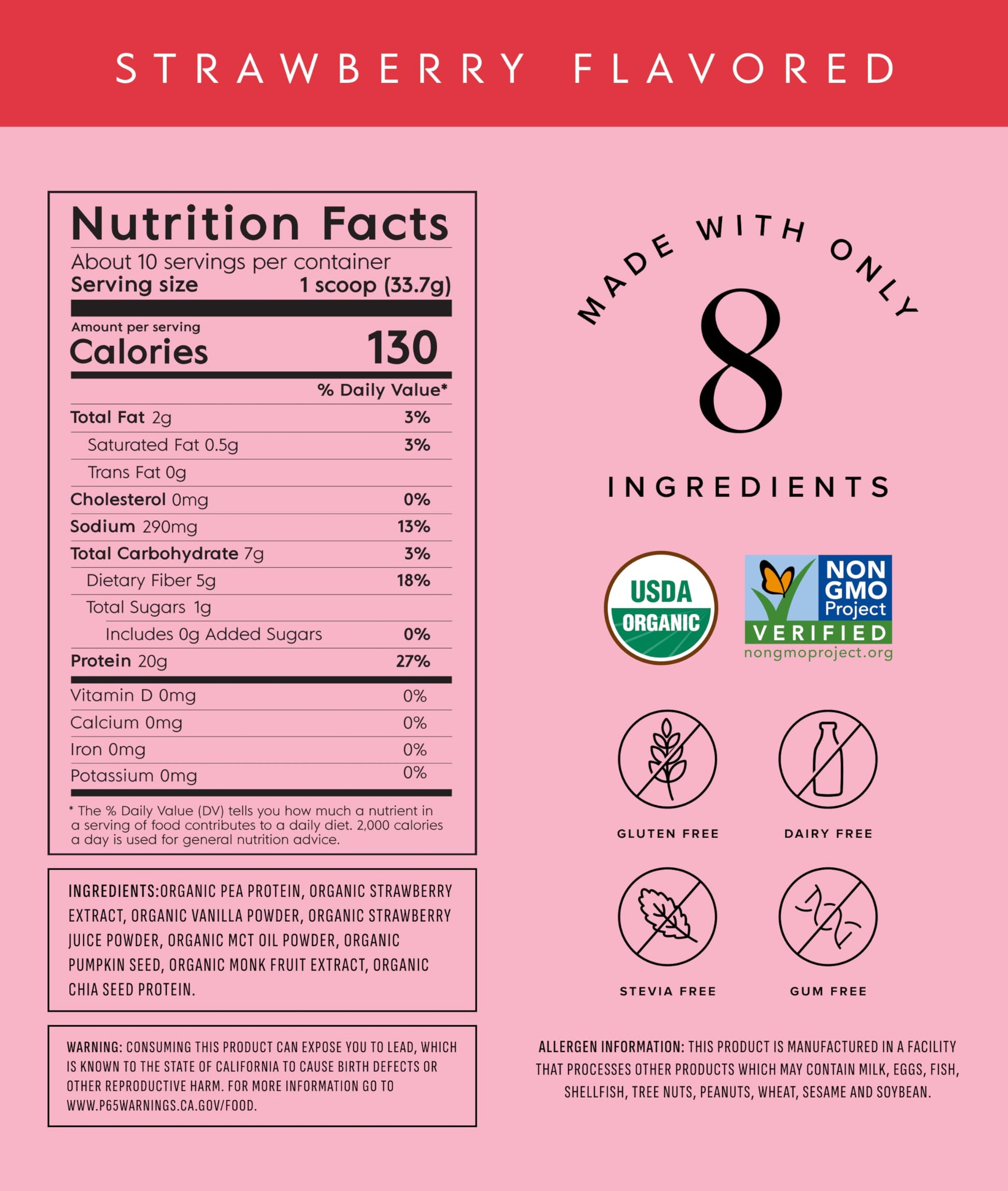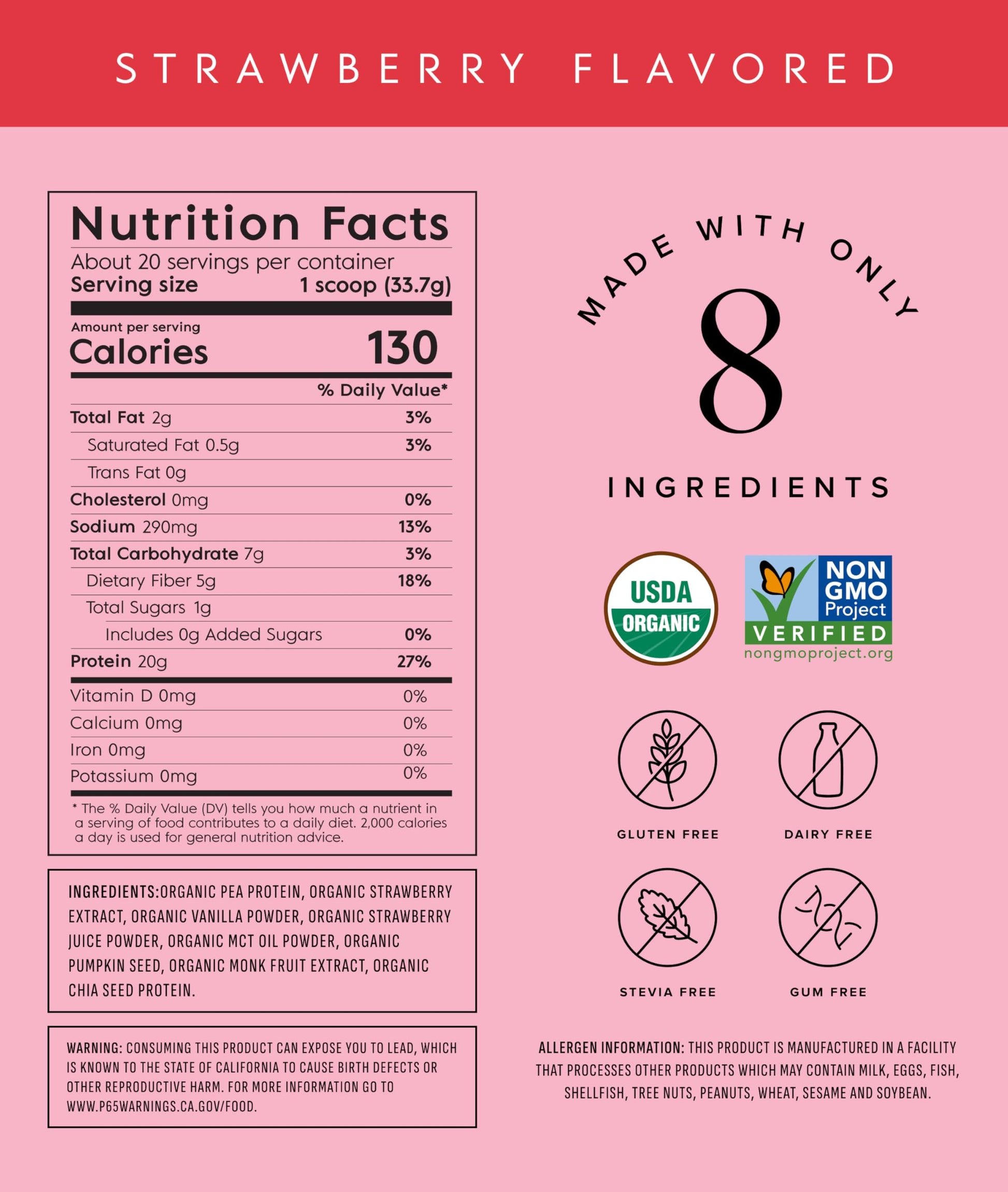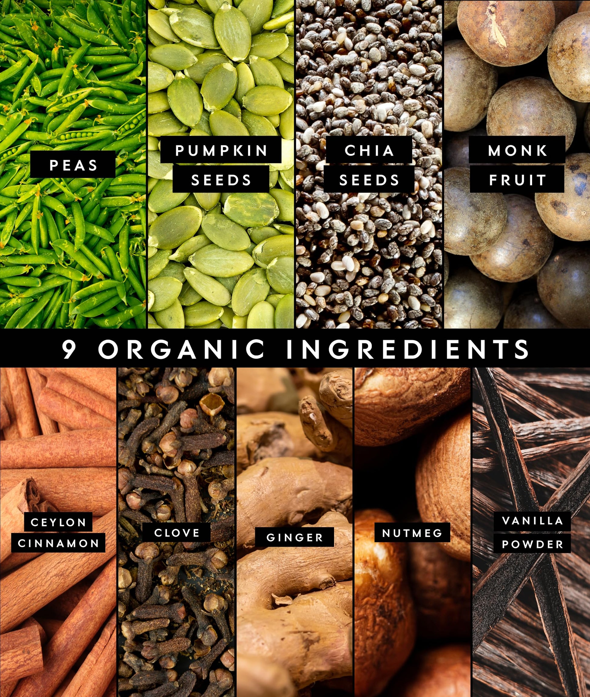- Certified USDA Organic: Trust in the integrity of our plant-based vegan protein powder, certified USDA Organic, non-GMO, and vegan-friendly. Our straightforward label and simple ingredients ensure transparency and quality. Protein sourced from all organic pea, pumpkin seed, and chia seed.